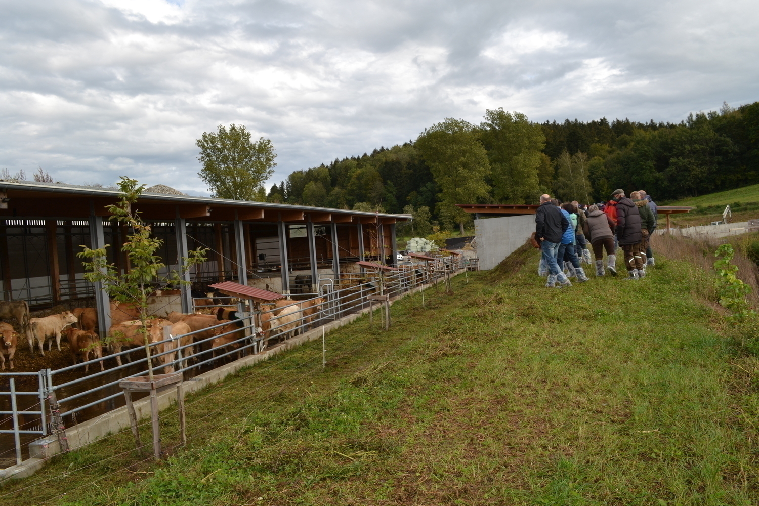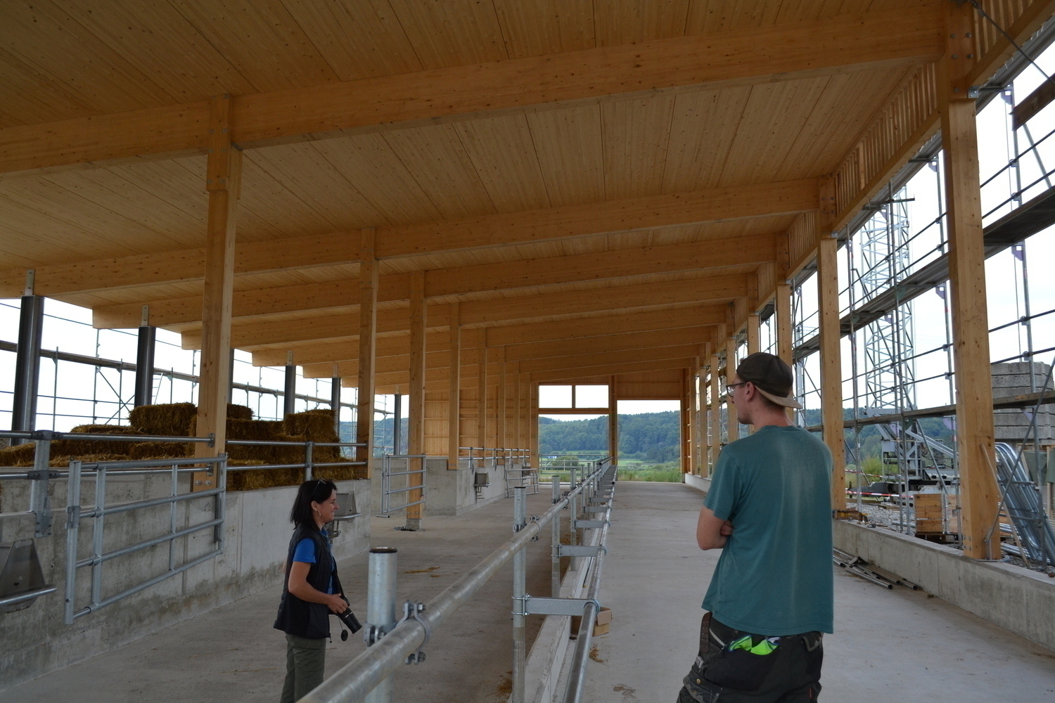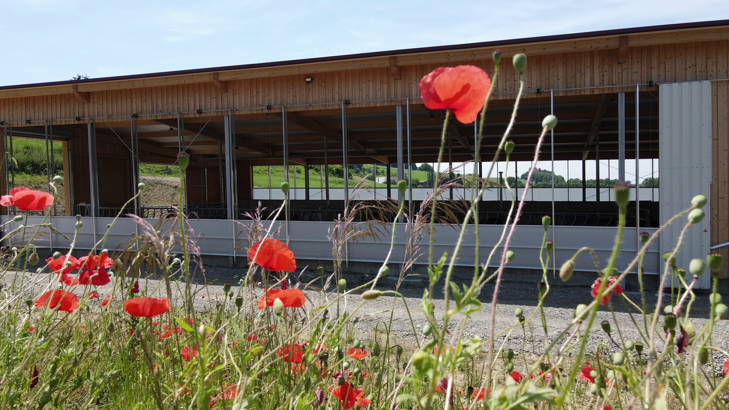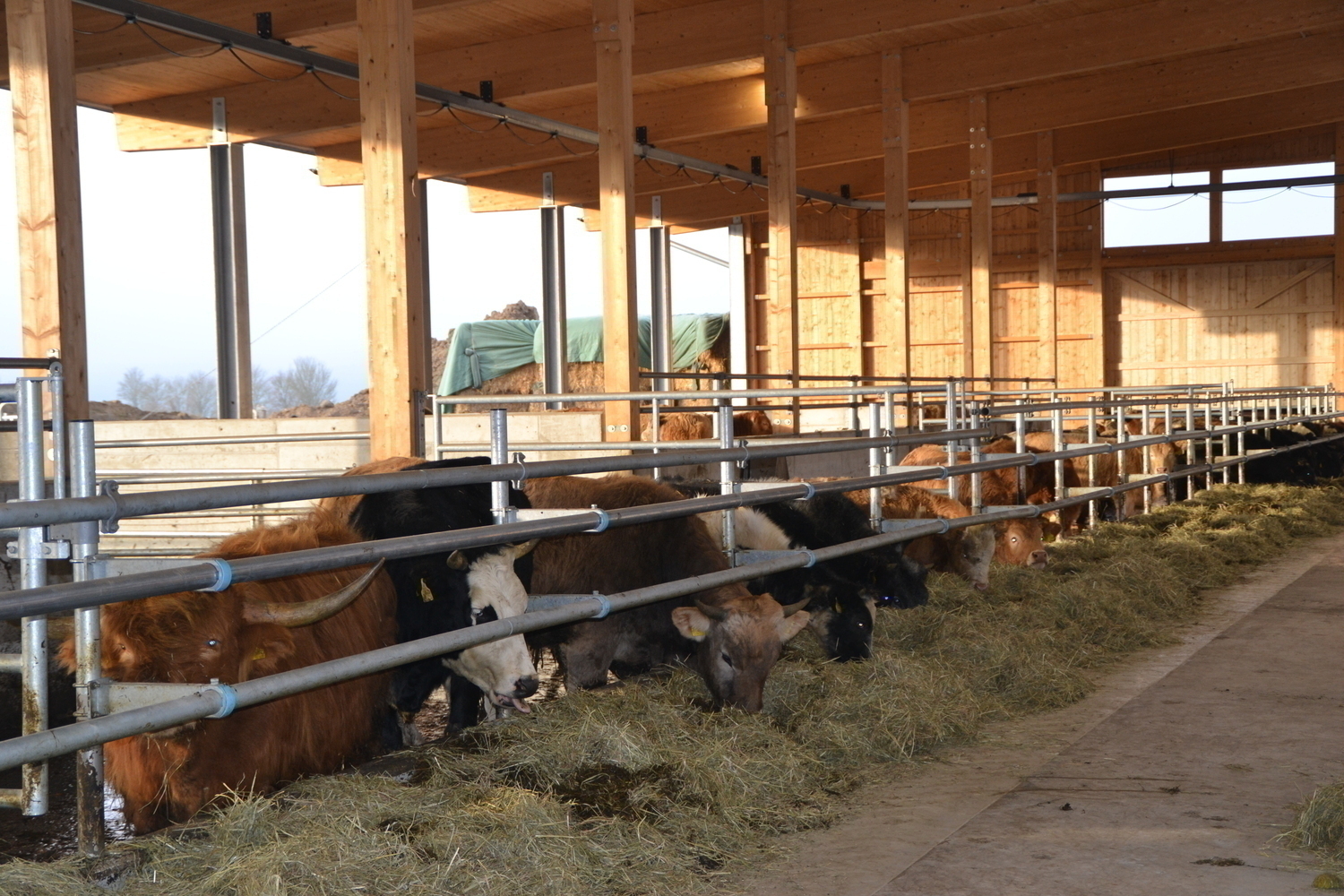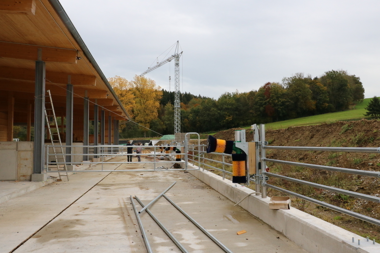 Der Besucherwall erlaubt einen direkten Einblick in den Maststall, auf die Weide der Mutterkühe und zum Hühnermobil