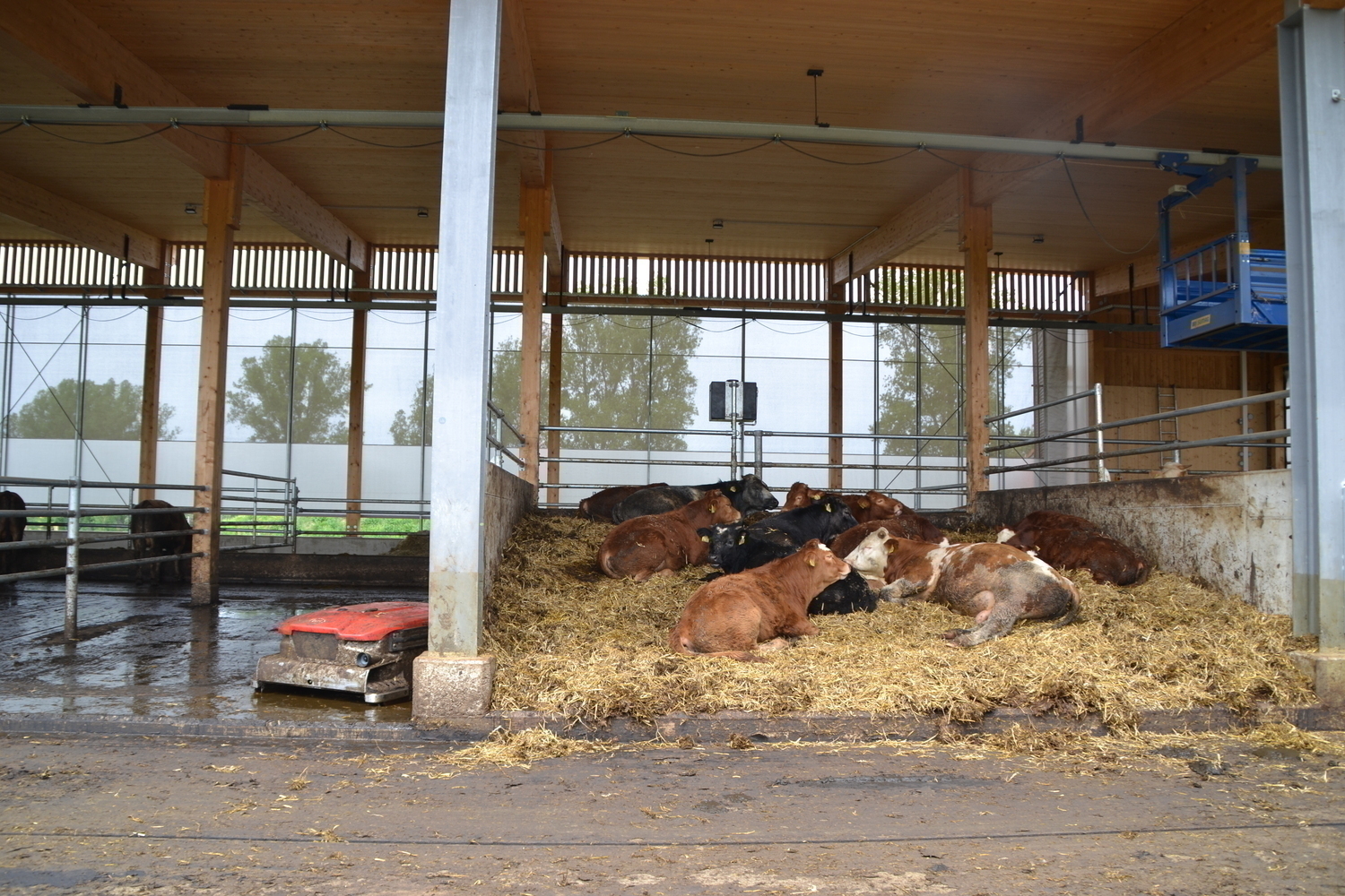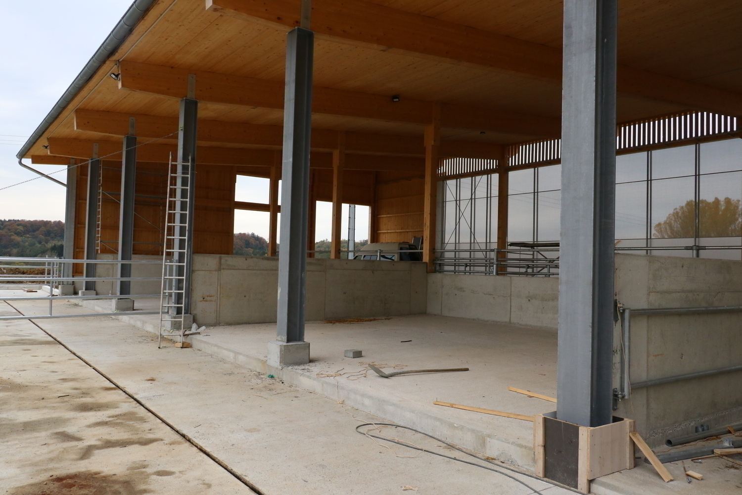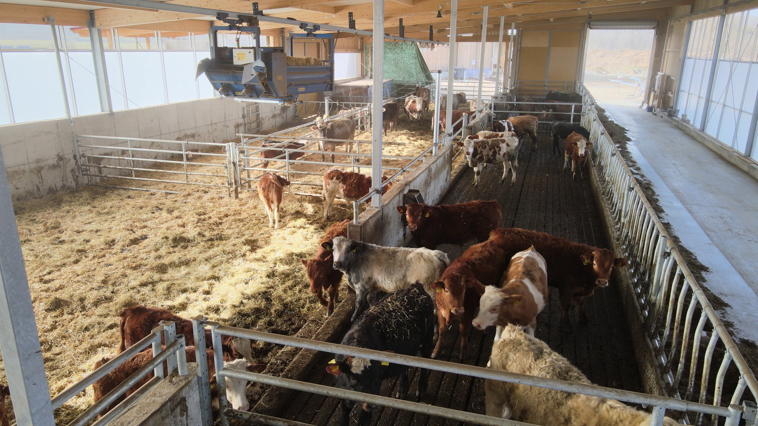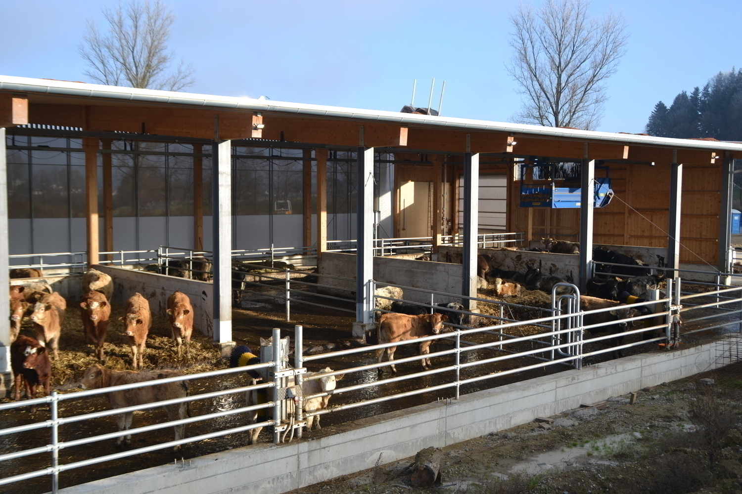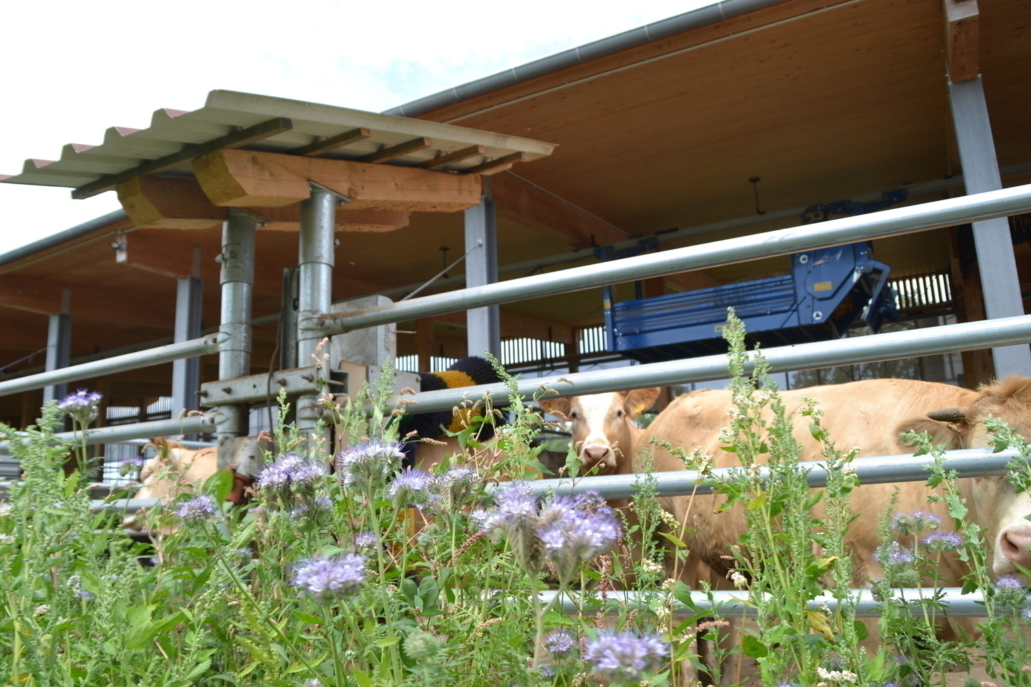 Der Besucherwall erlaubt einen direkten Einblick in den Maststall, auf die Weide der Mutterkühe und zum Hühnermobil