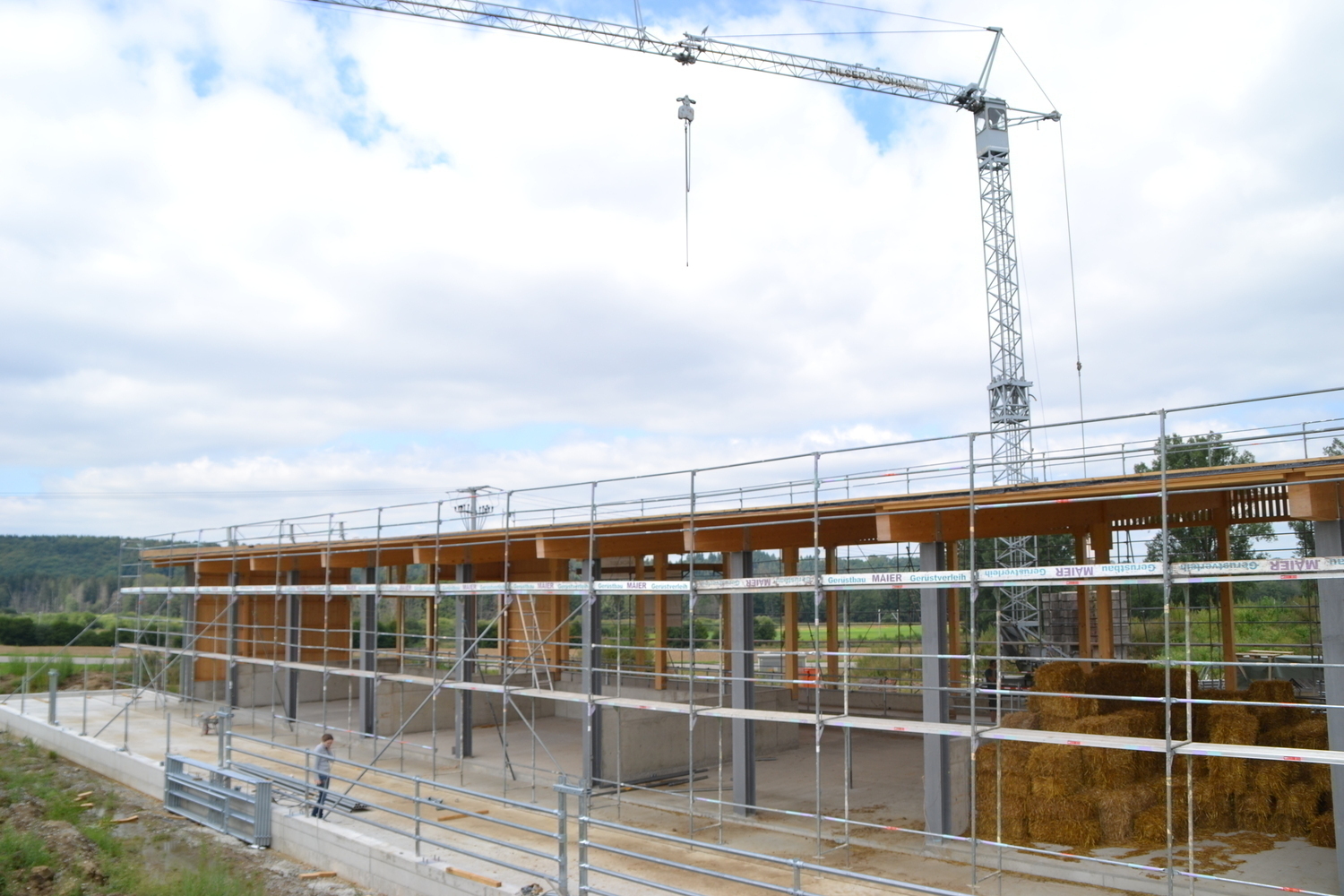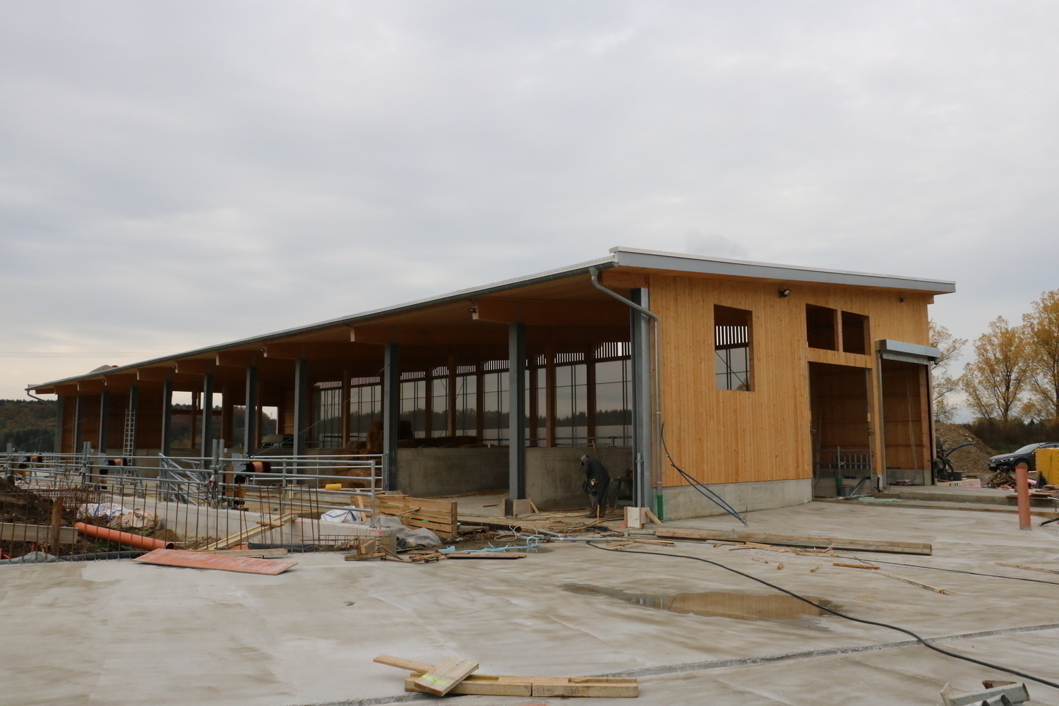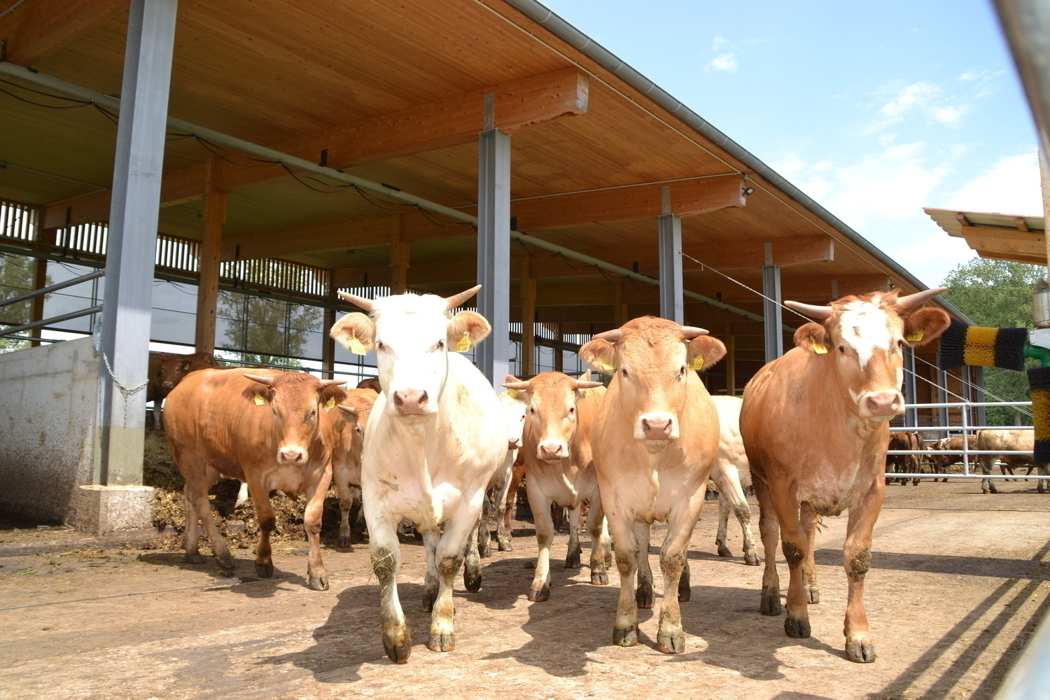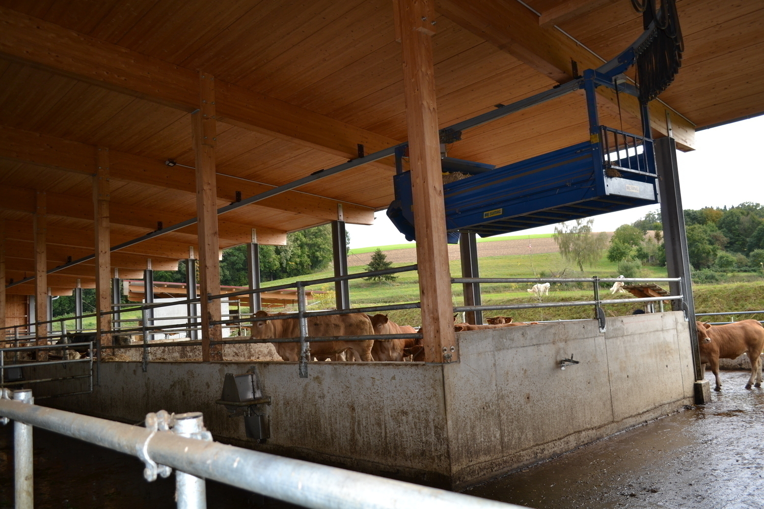 Der Besucherwall erlaubt einen direkten Einblick in den Maststall, auf die Weide der Mutterkühe und zum Hühnermobil