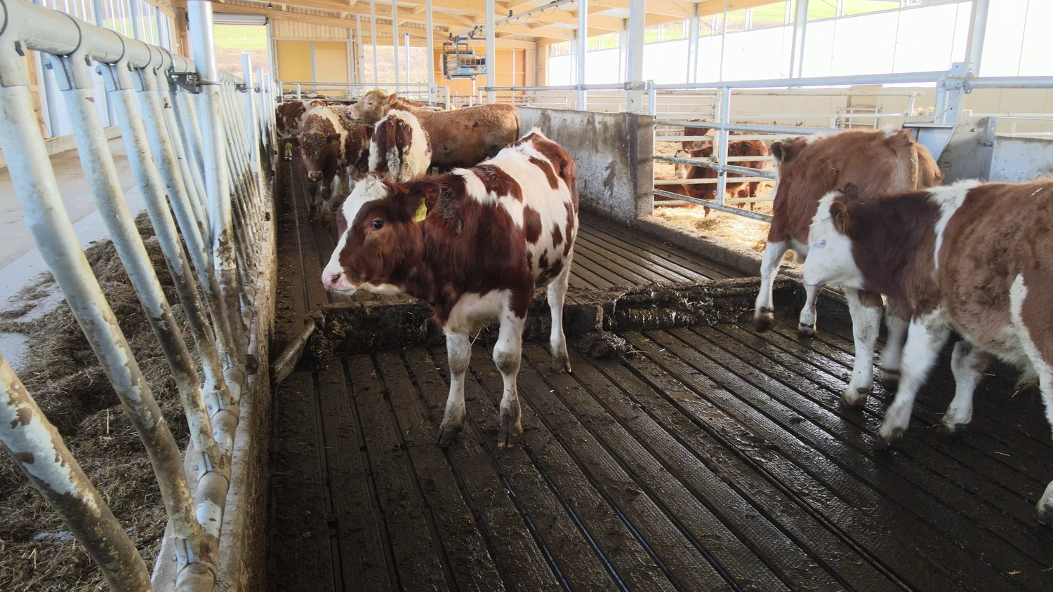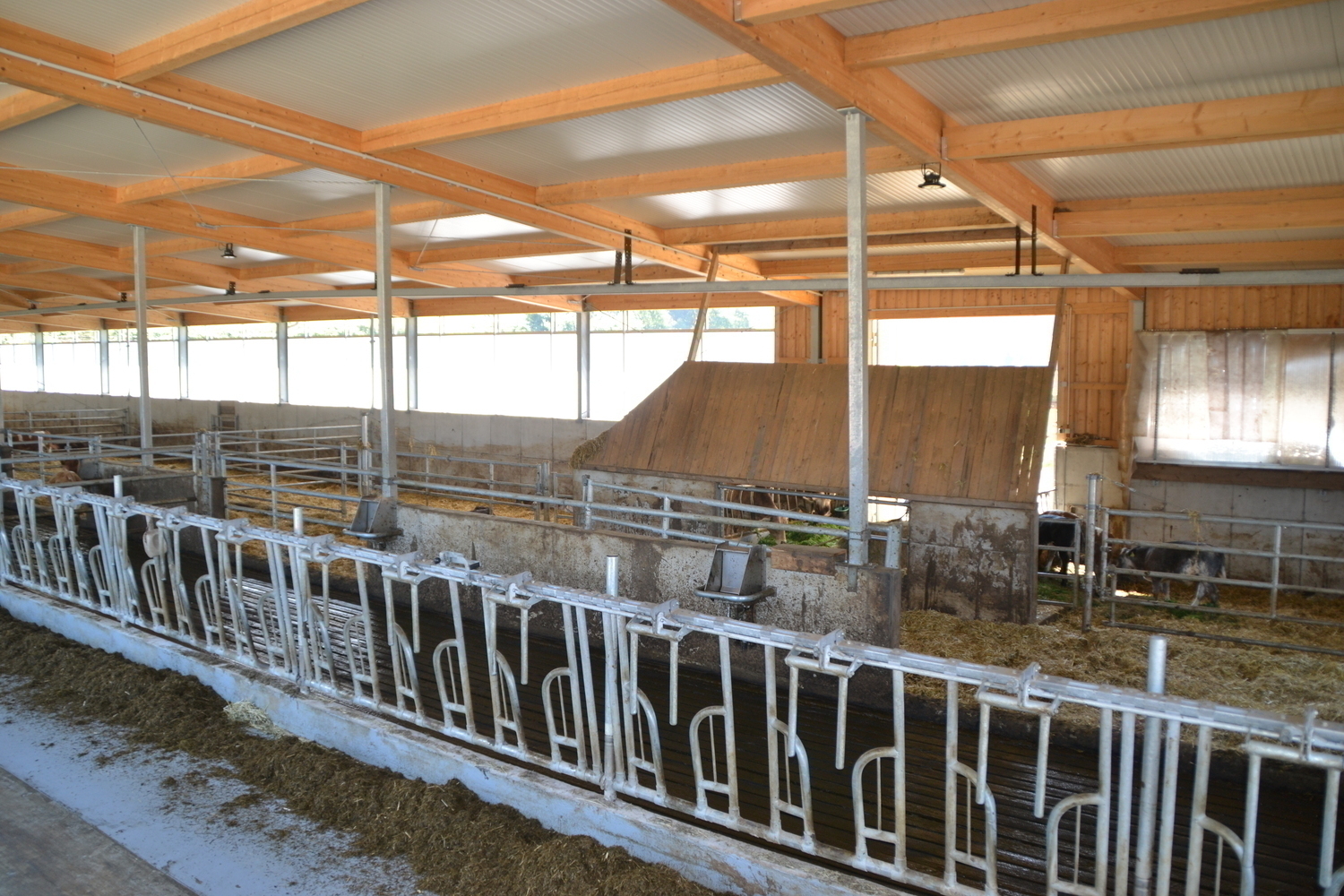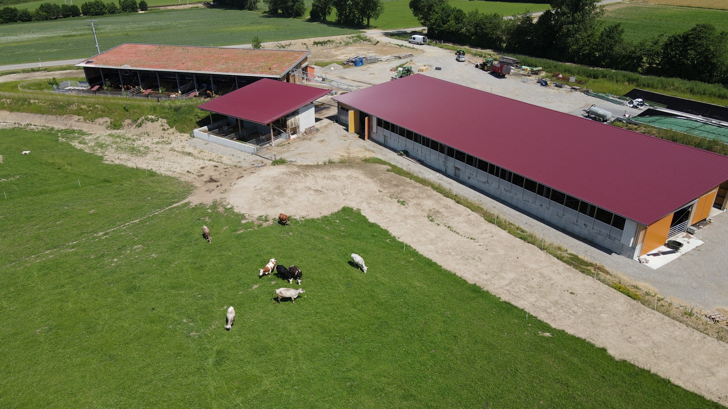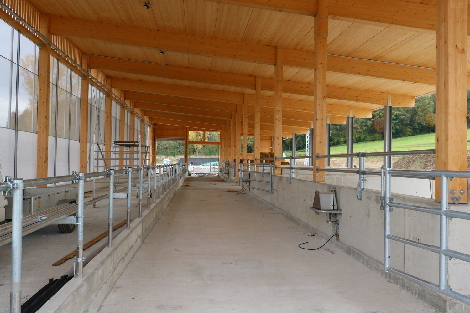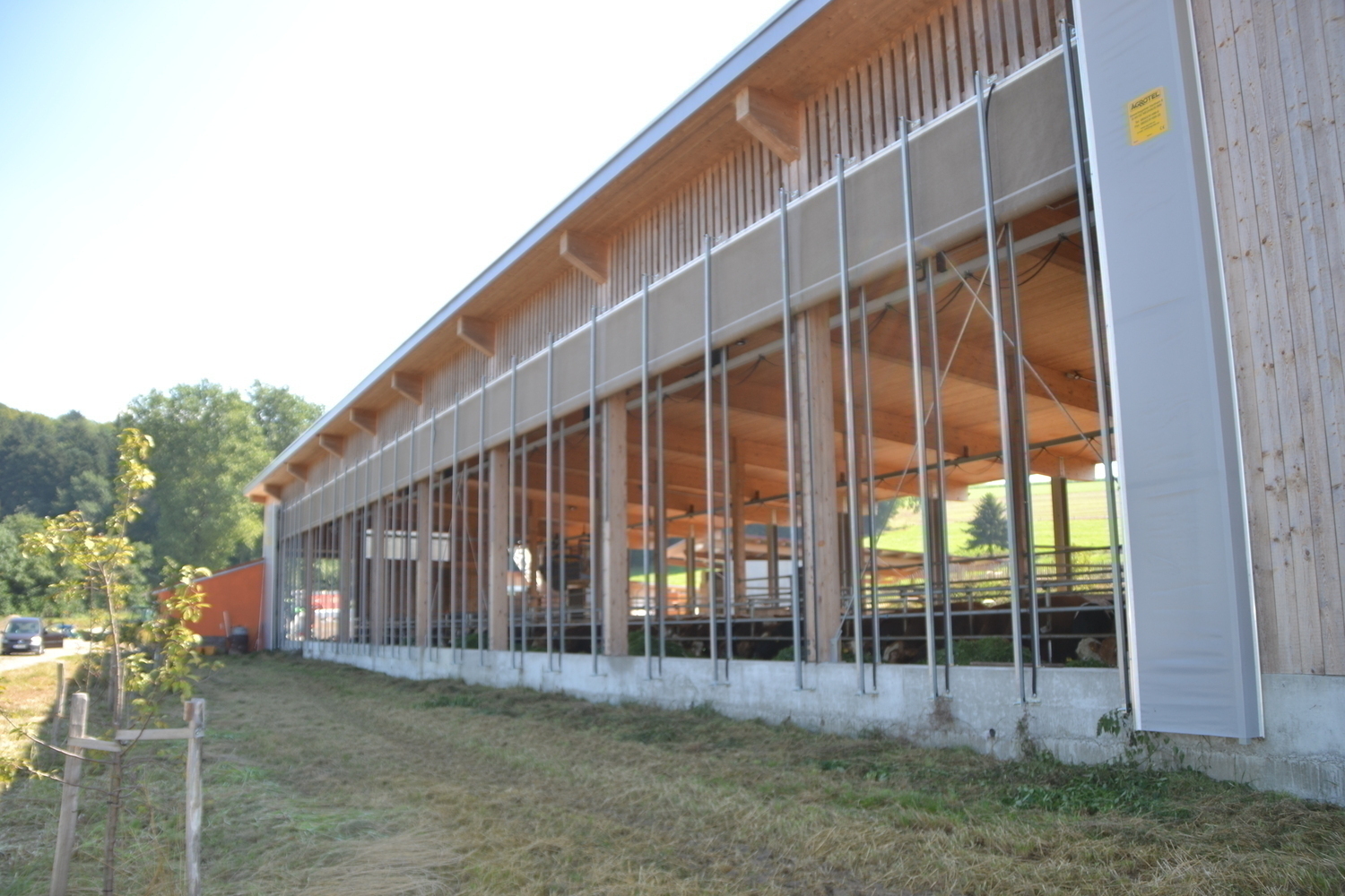 Der Besucherwall erlaubt einen direkten Einblick in den Maststall, auf die Weide der Mutterkühe und zum Hühnermobil