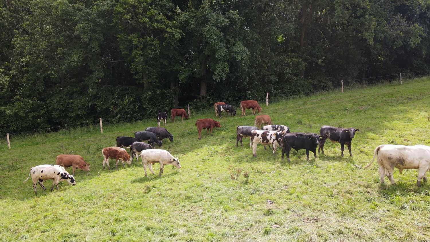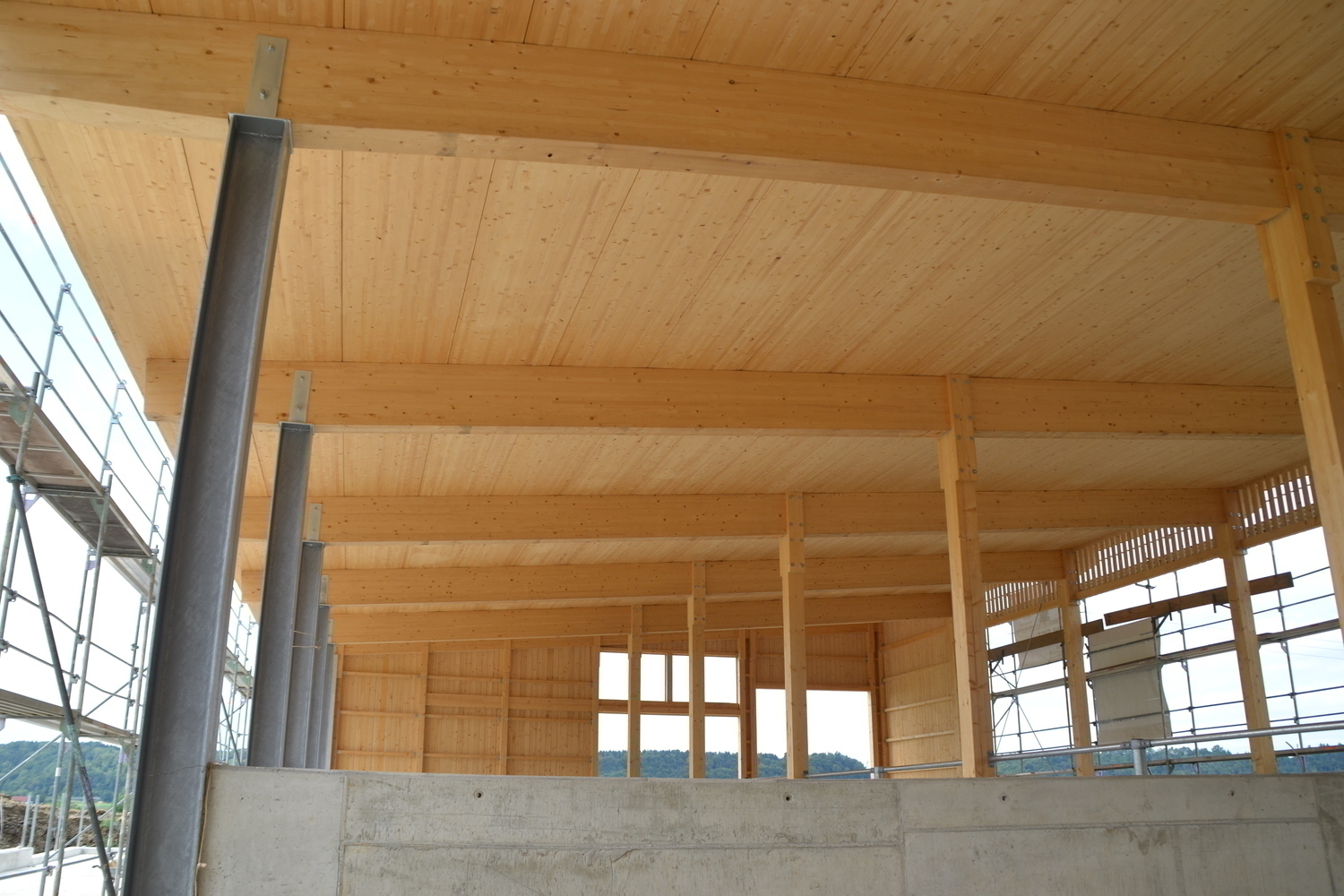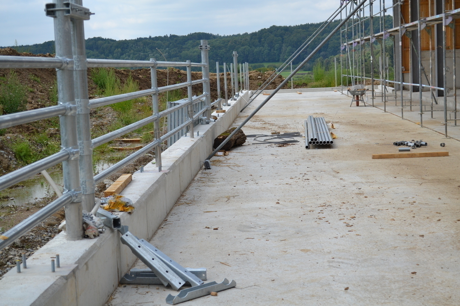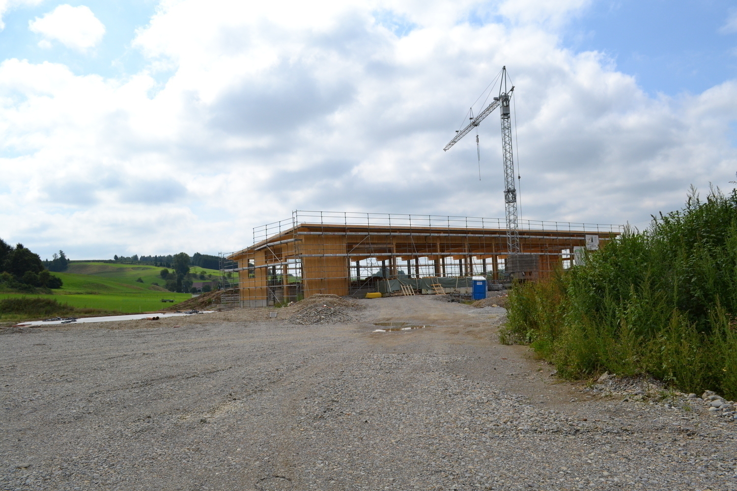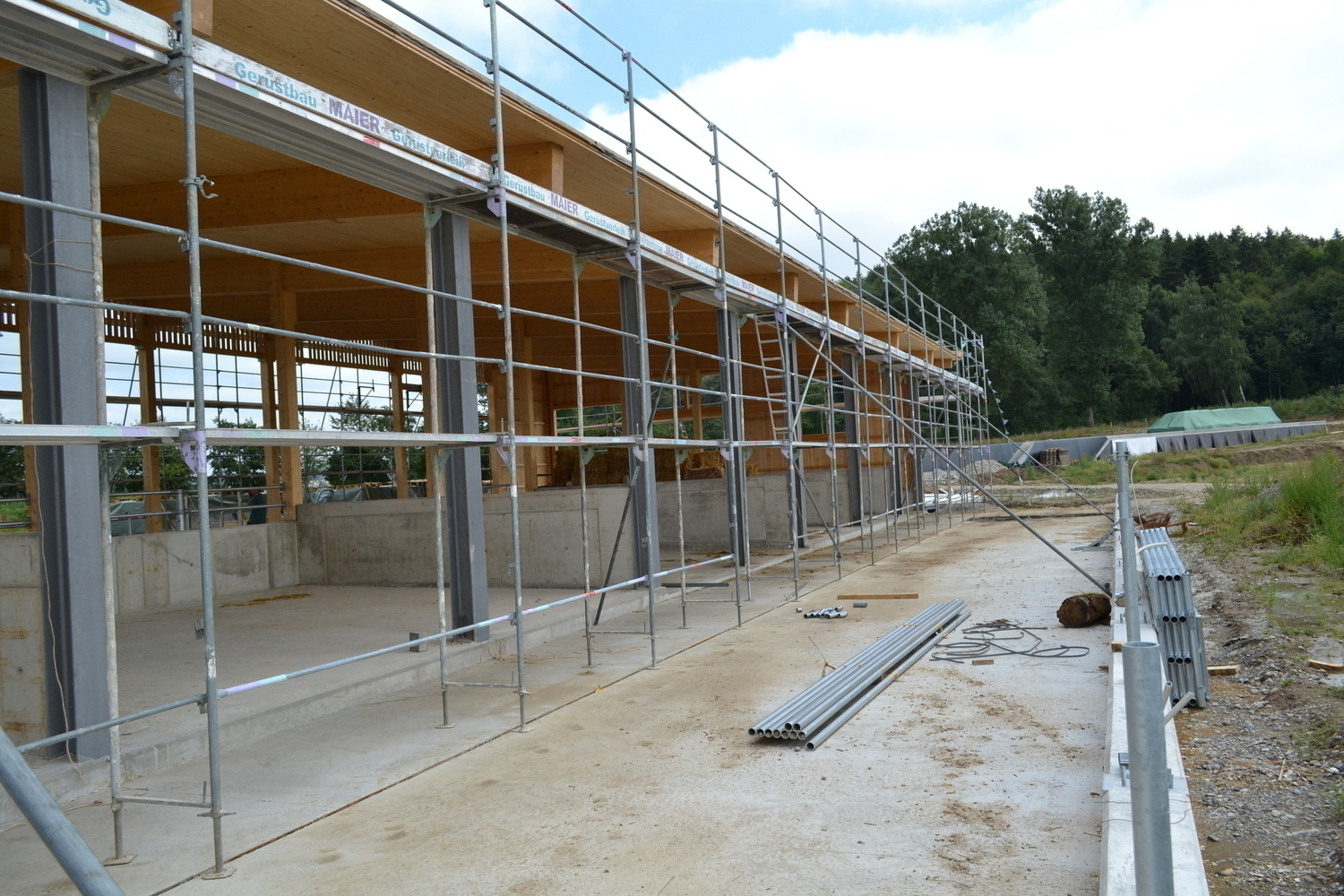 Der Besucherwall erlaubt einen direkten Einblick in den Maststall, auf die Weide der Mutterkühe und zum Hühnermobil
