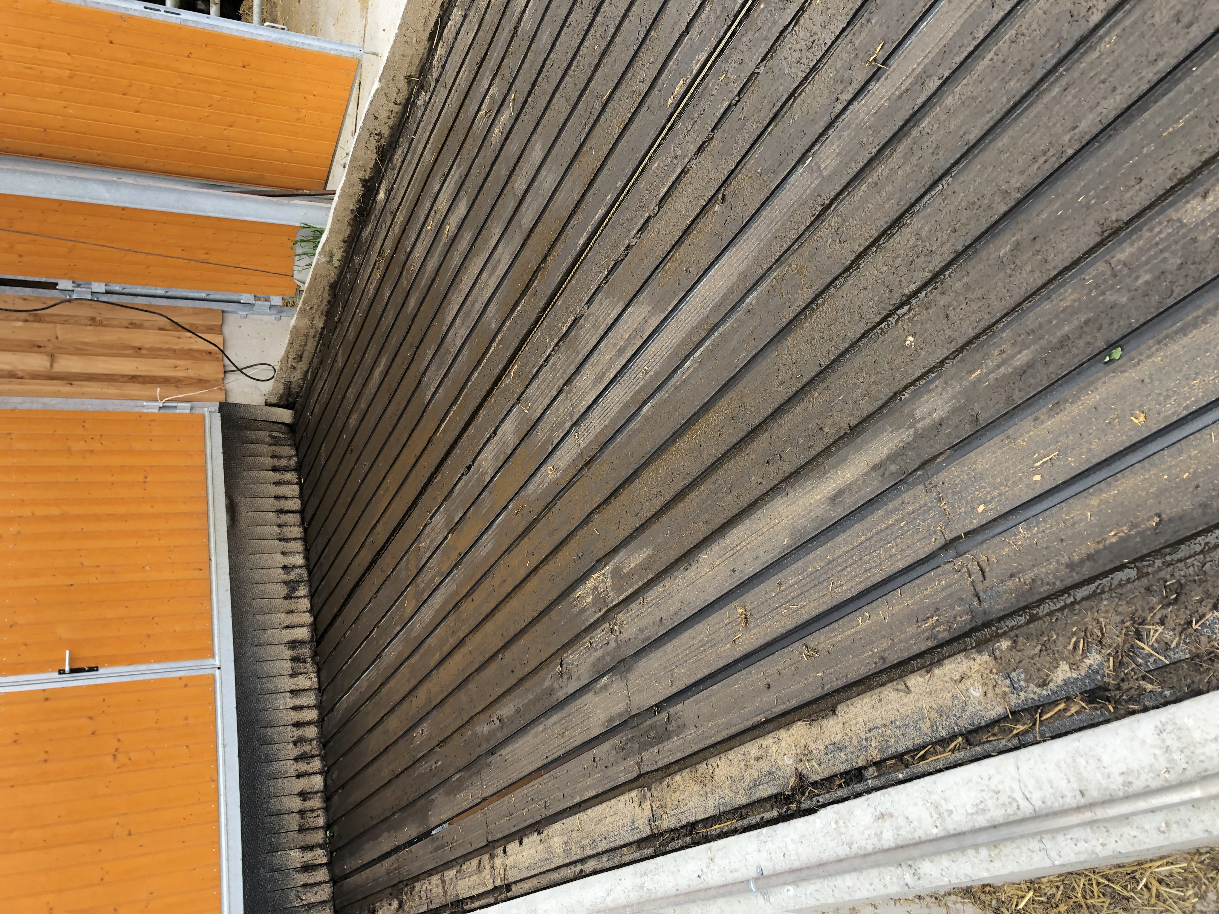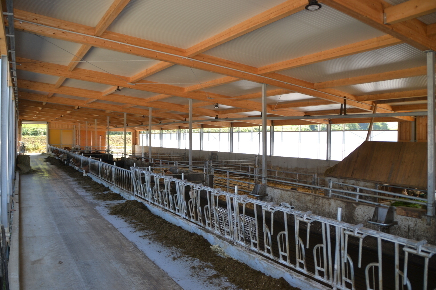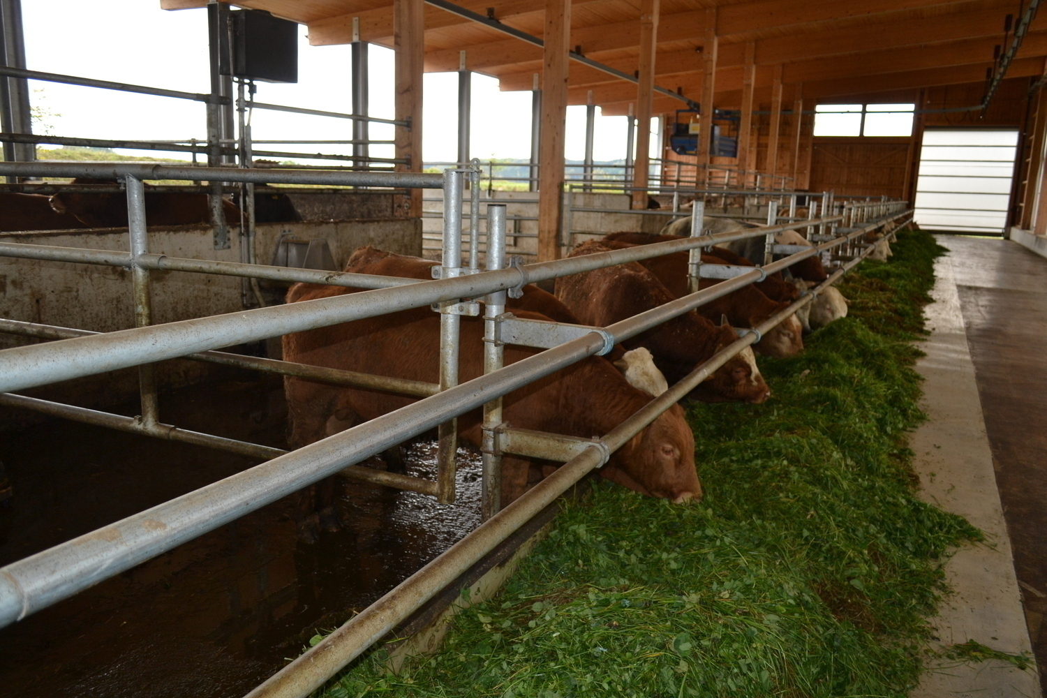 Das Selbstfangfressgitter ist gut für die horntragenden Kuehe geeignet (Fa. Zimmermann, Modell "Oeko")