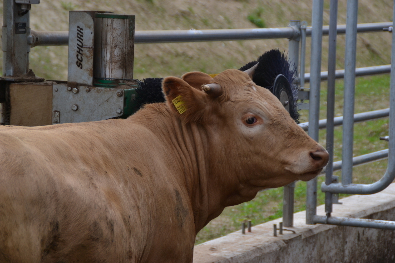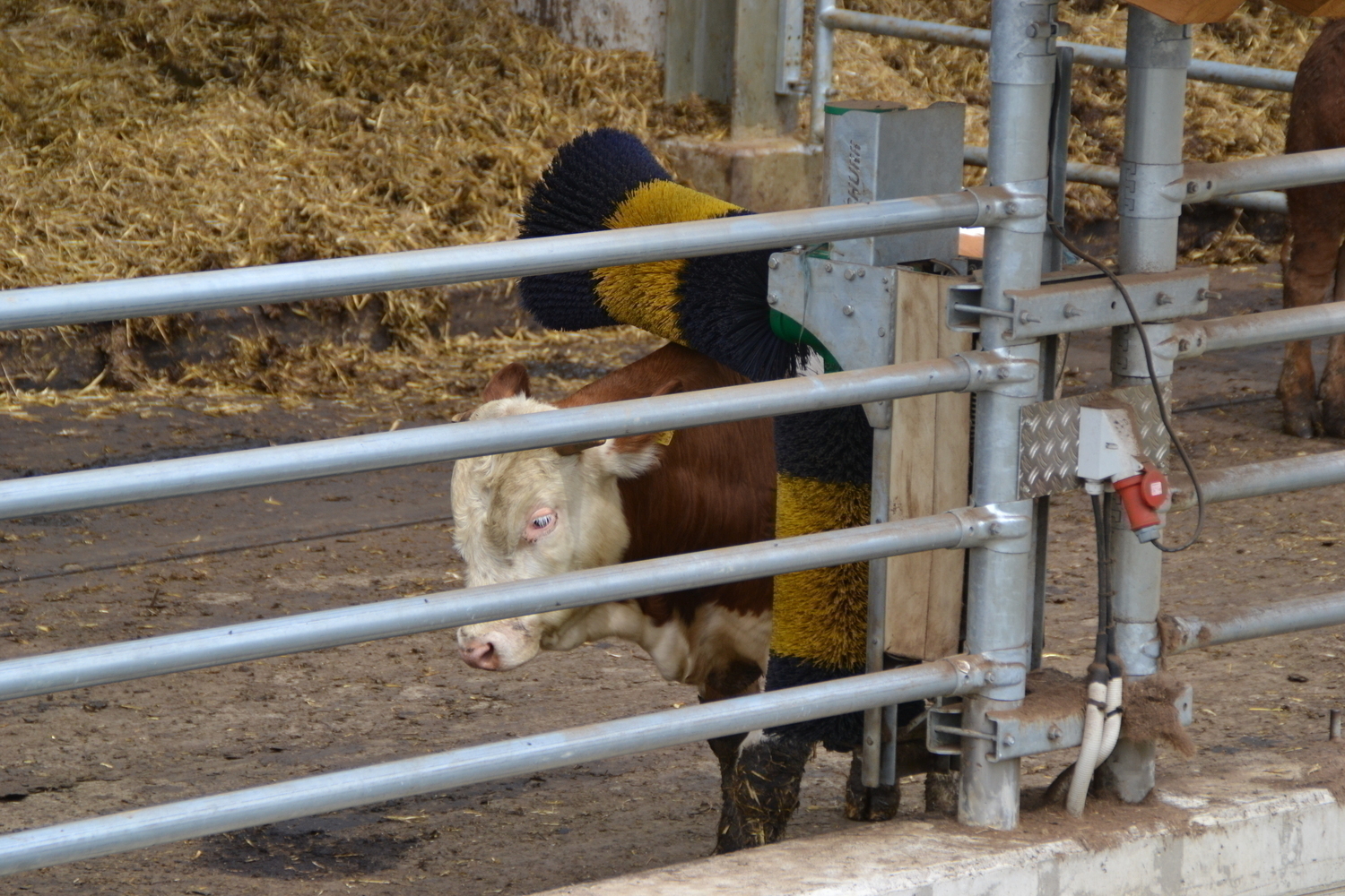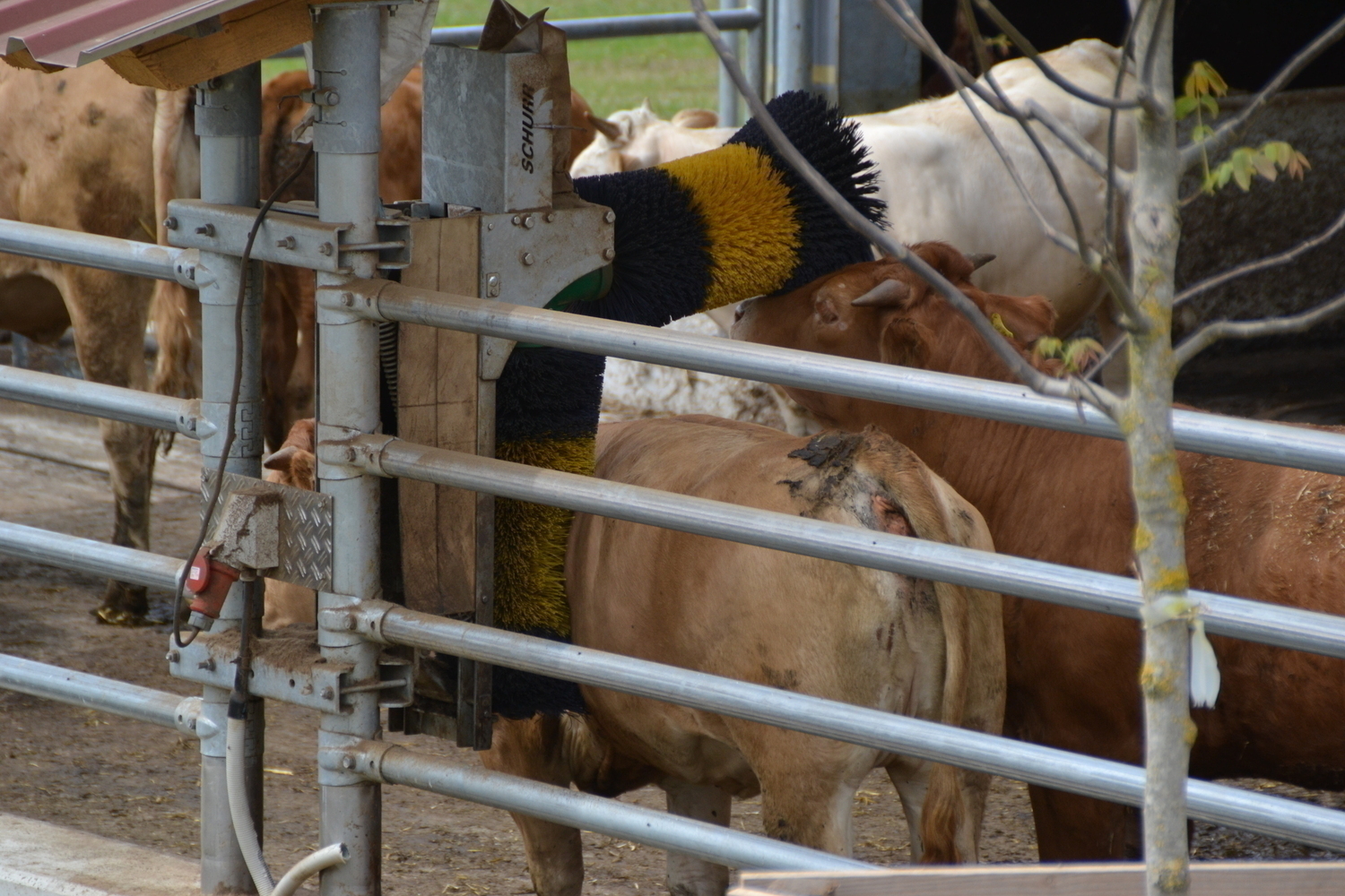 Hier teilen sich zwei Mastbullen die Putzeinrichtung, einer nimmt die senkrechte, der andere die horizontale Buerste.