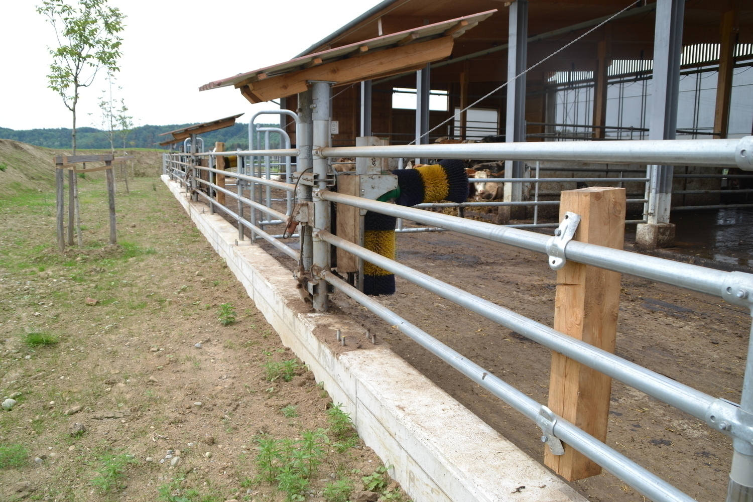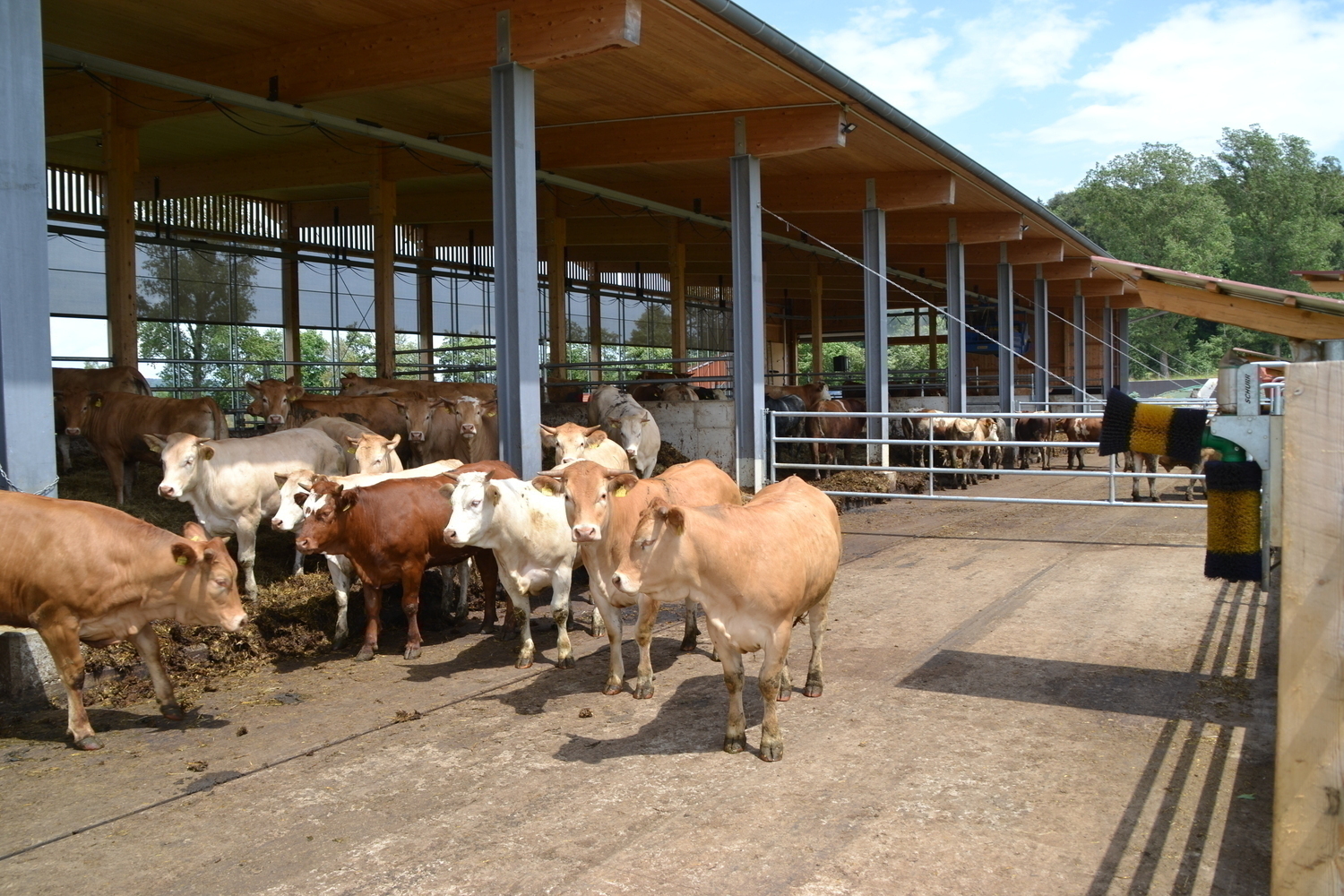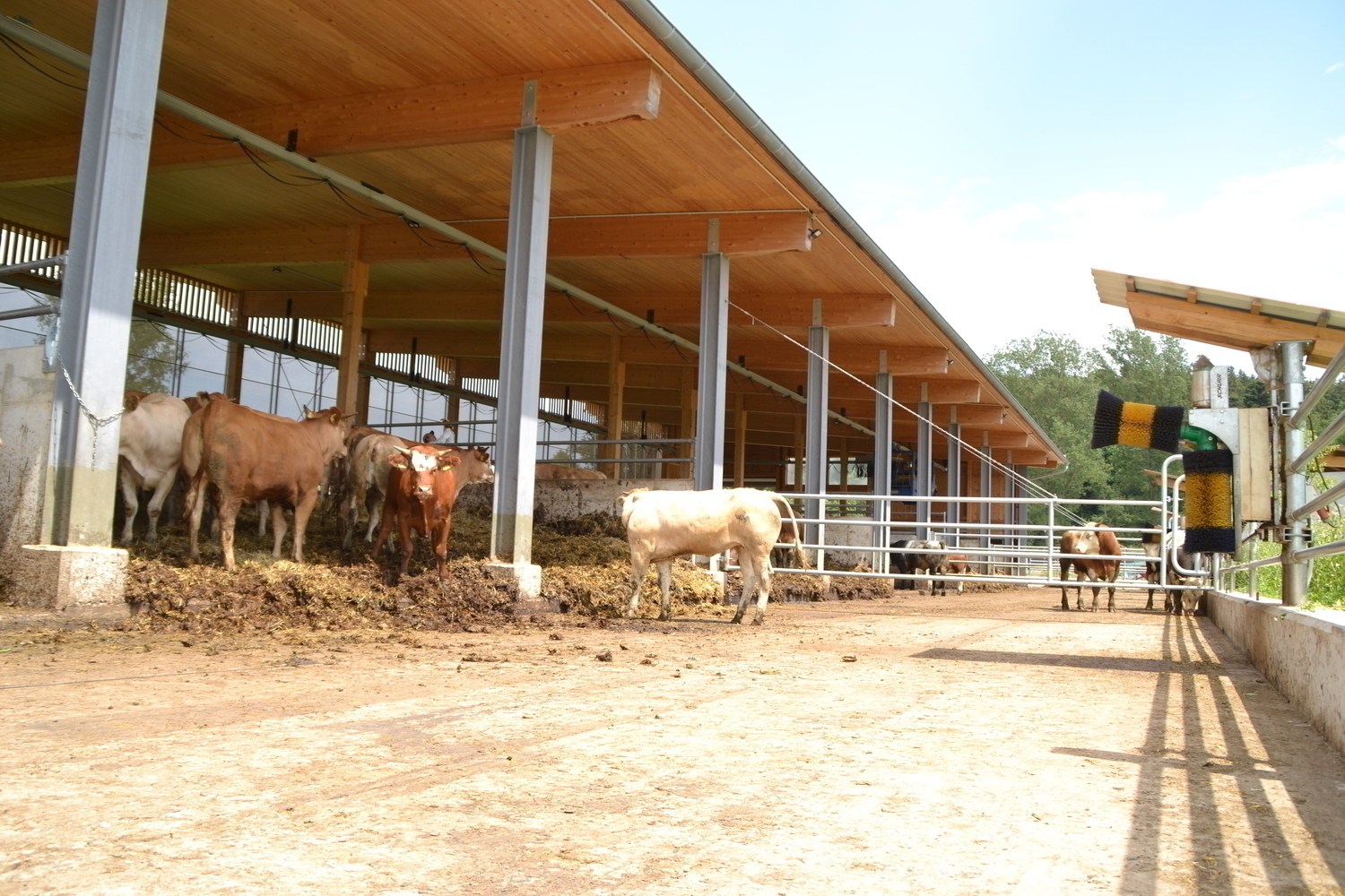 Hier teilen sich zwei Mastbullen die Putzeinrichtung, einer nimmt die senkrechte, der andere die horizontale Buerste.
