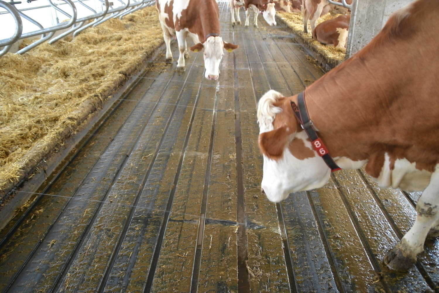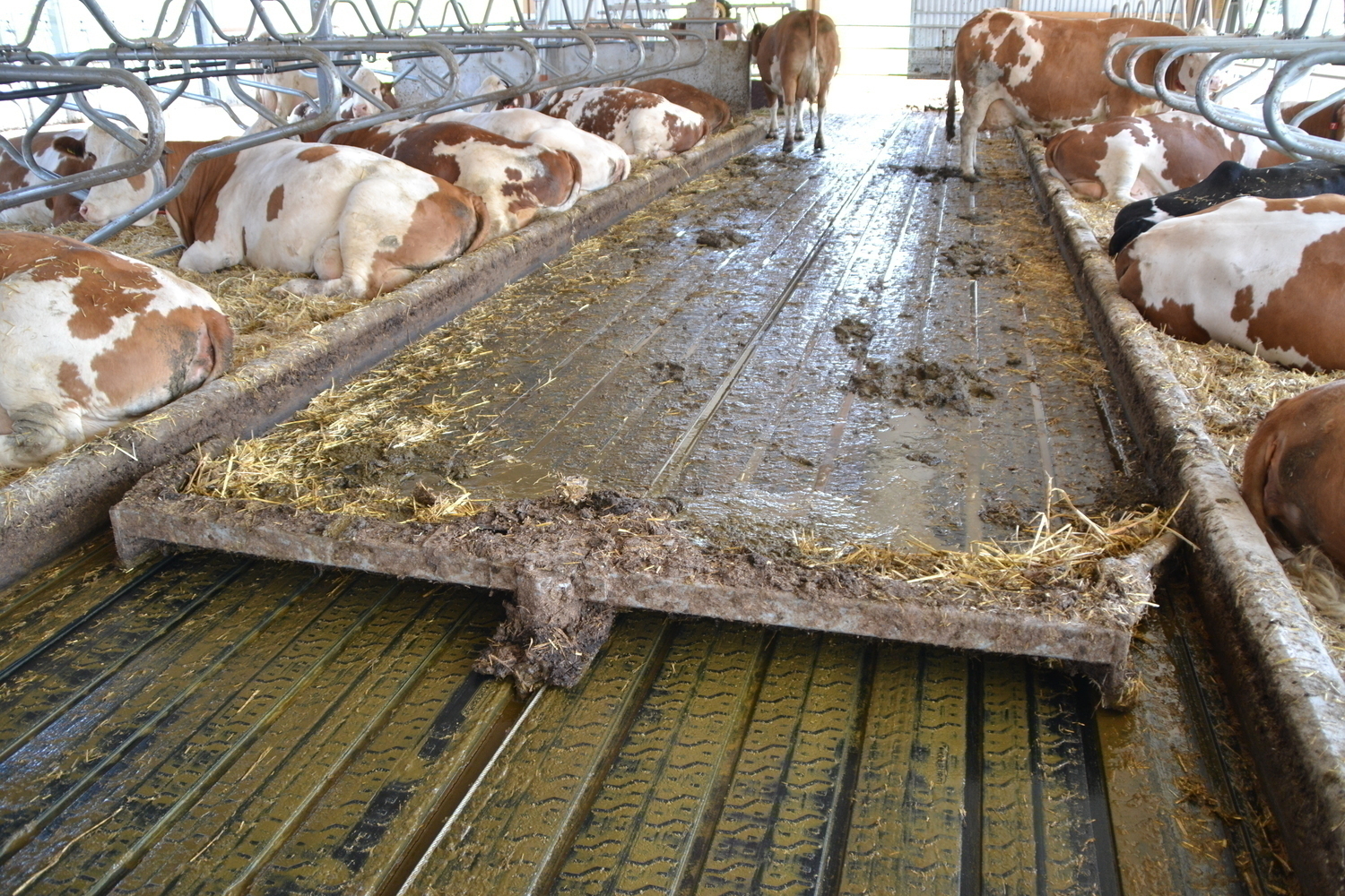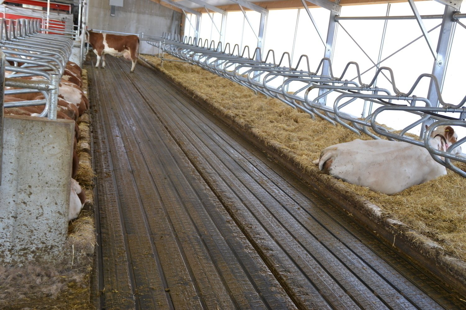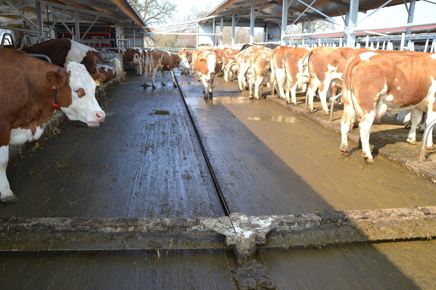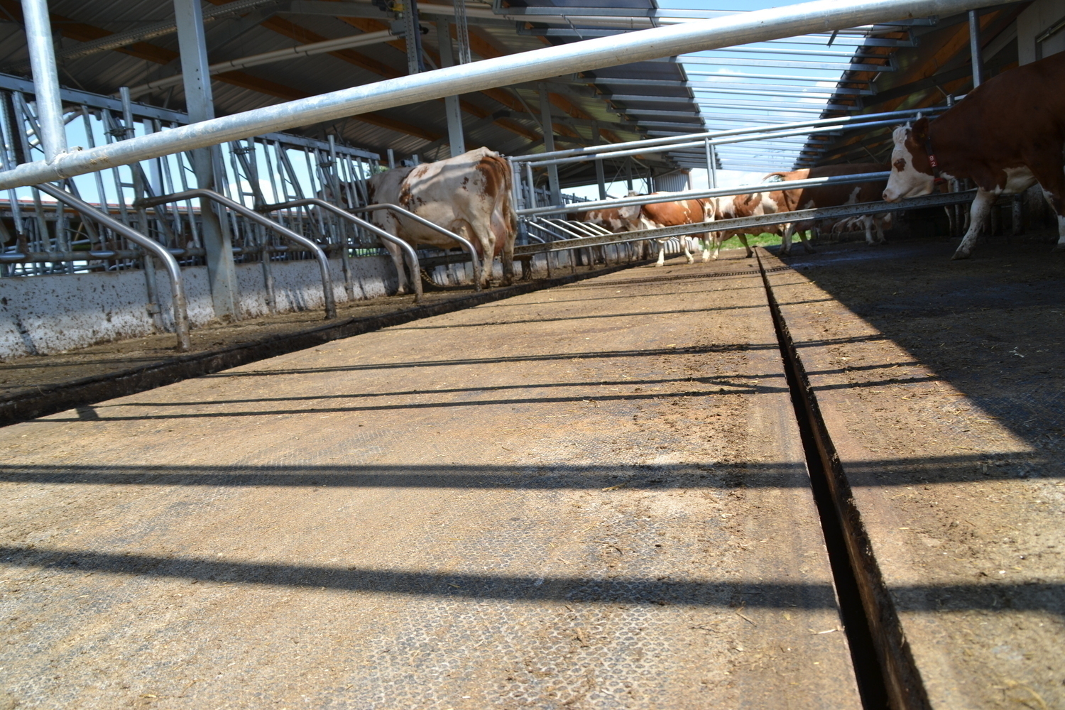 Die Böden der Fressgänge sind ebenfalls emissionsmindernd ausgeführt. Ein 3%-iges Quergefälle zu beiden Seiten einer Harnrinne leitet den Harn ab.