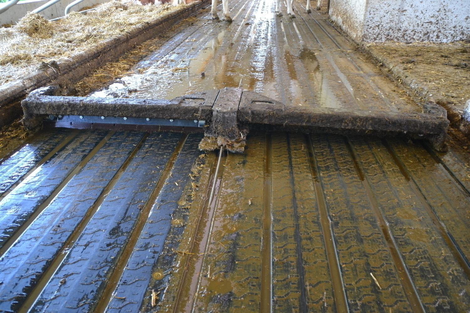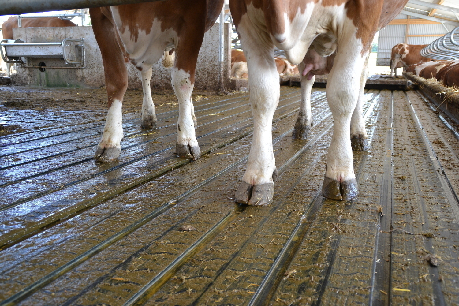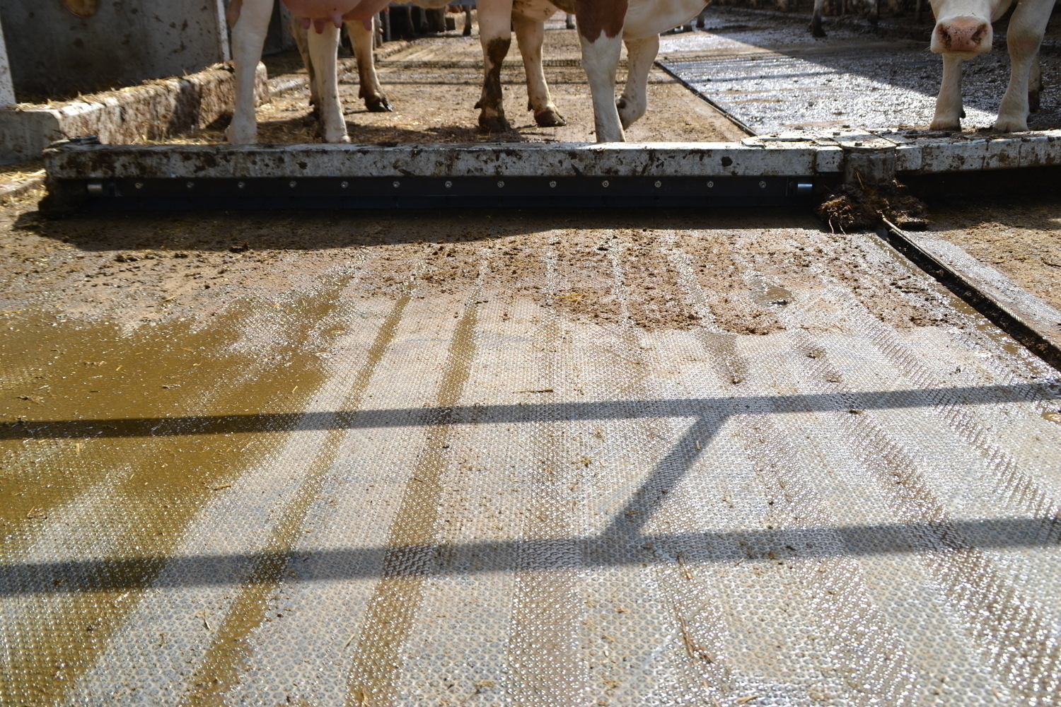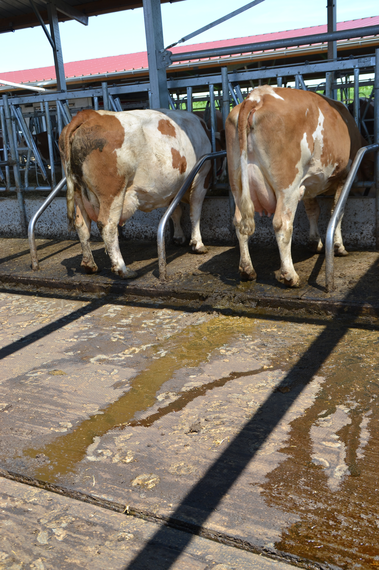 Die Böden der Fressgänge sind ebenfalls emissionsmindernd ausgeführt. Ein 3%-iges Quergefälle zu beiden Seiten einer Harnrinne leitet den Harn ab.