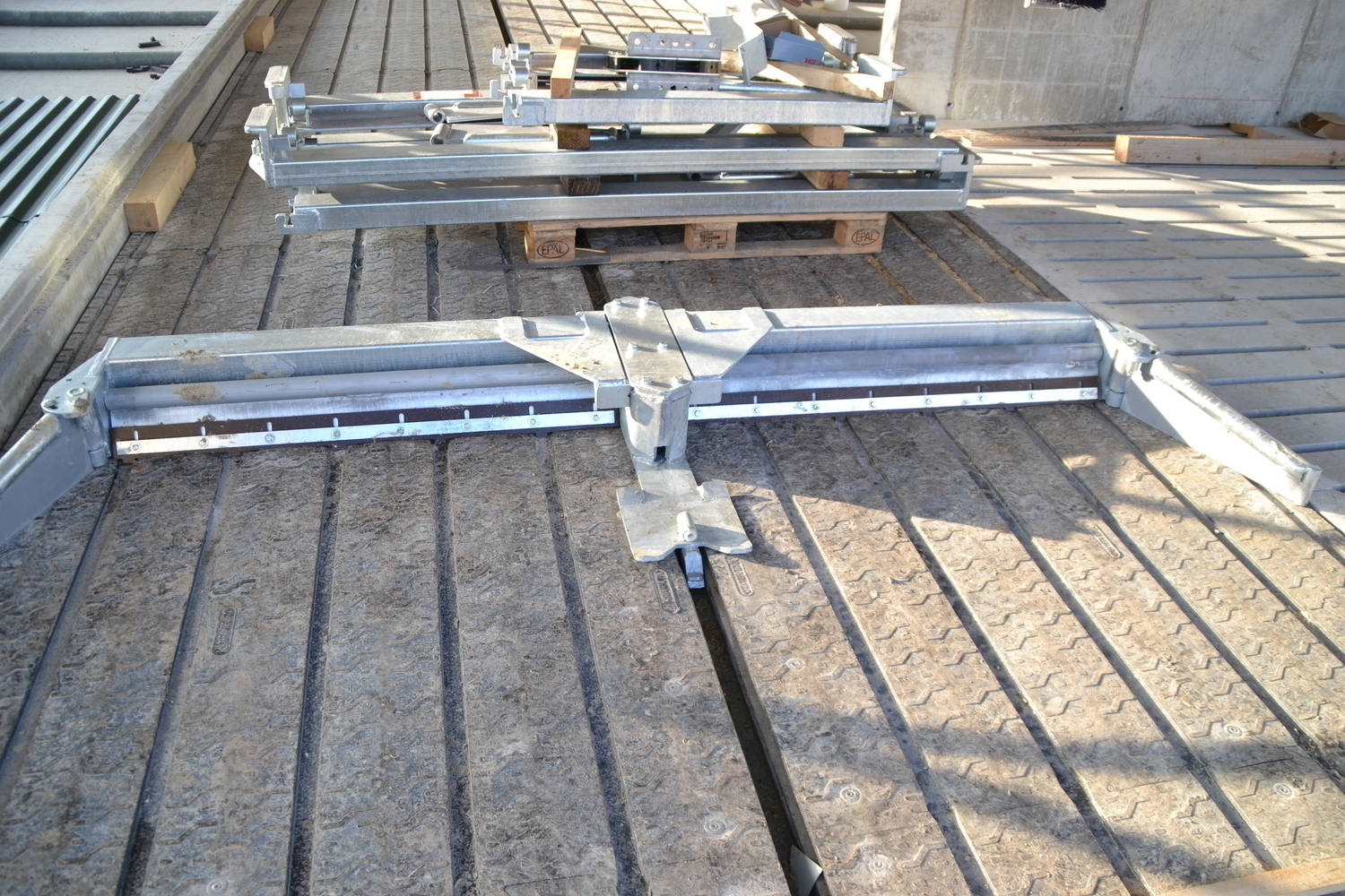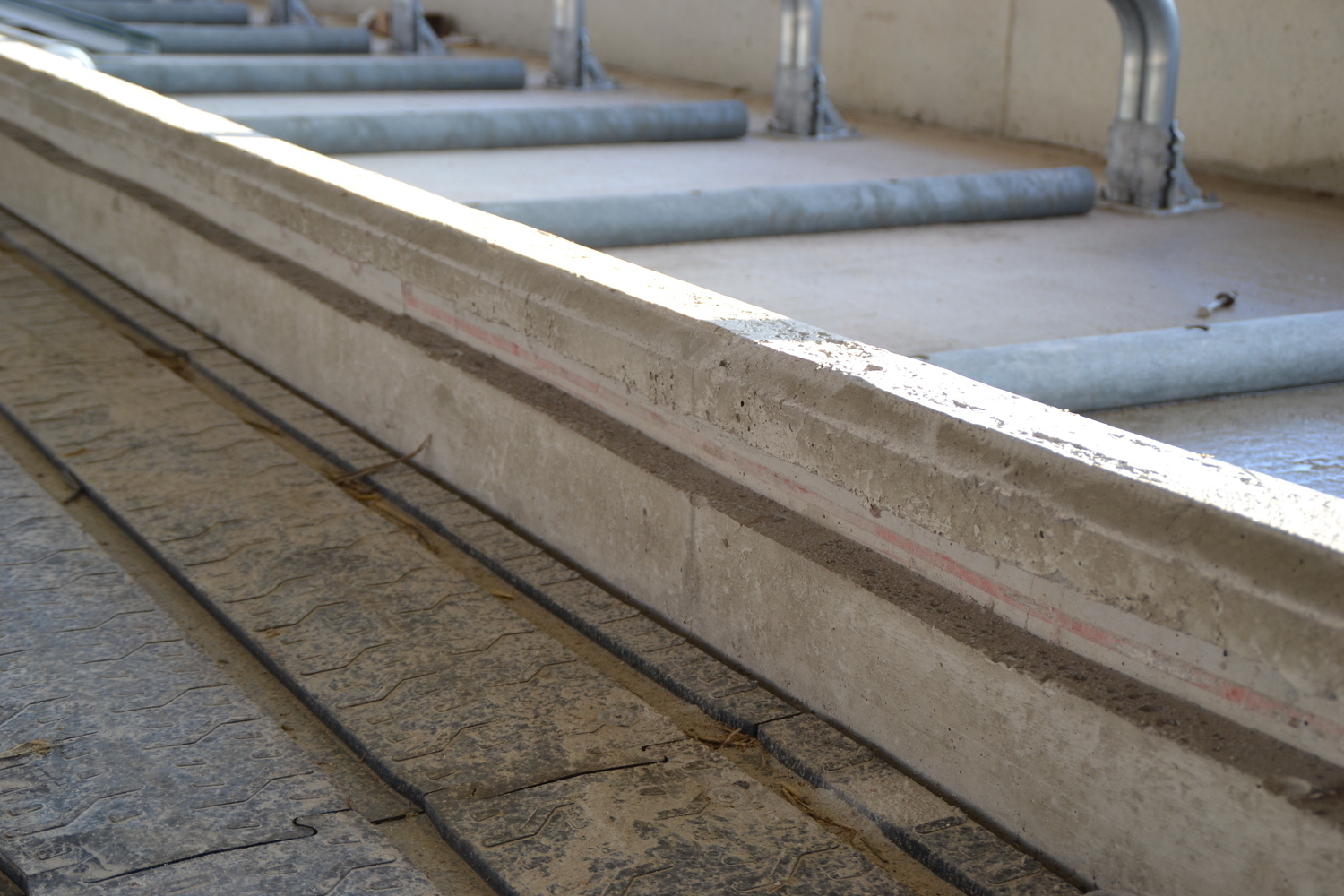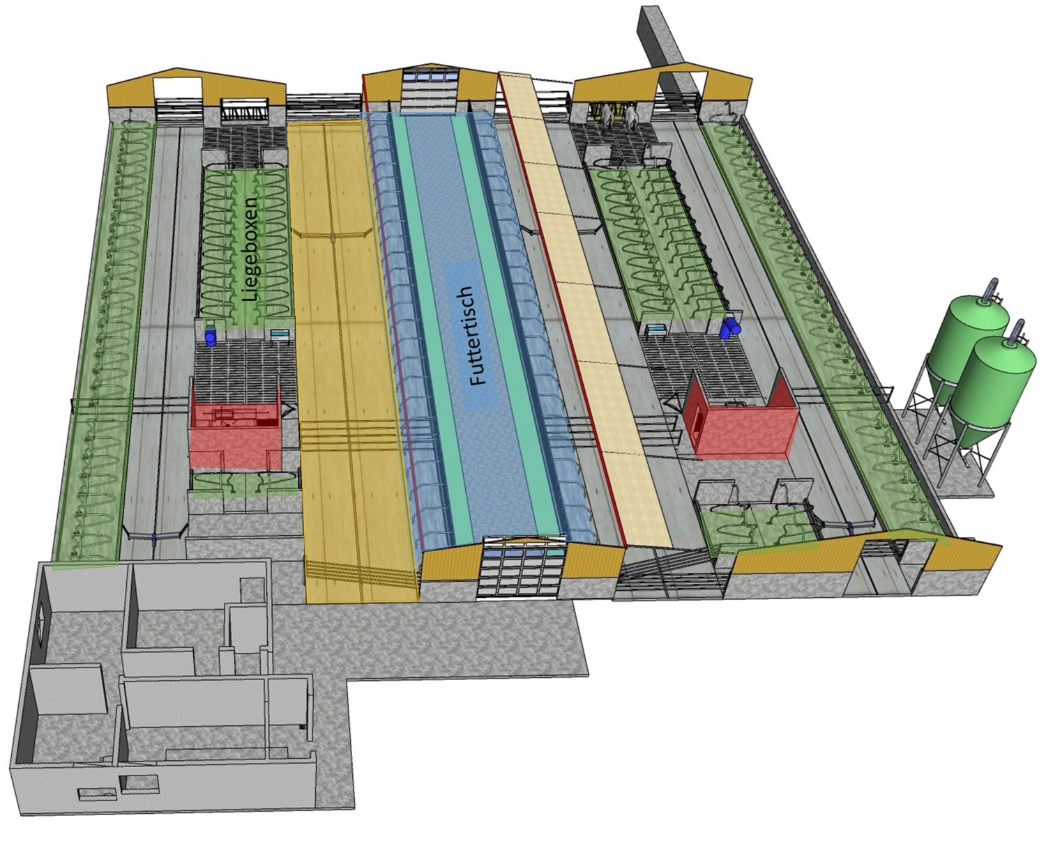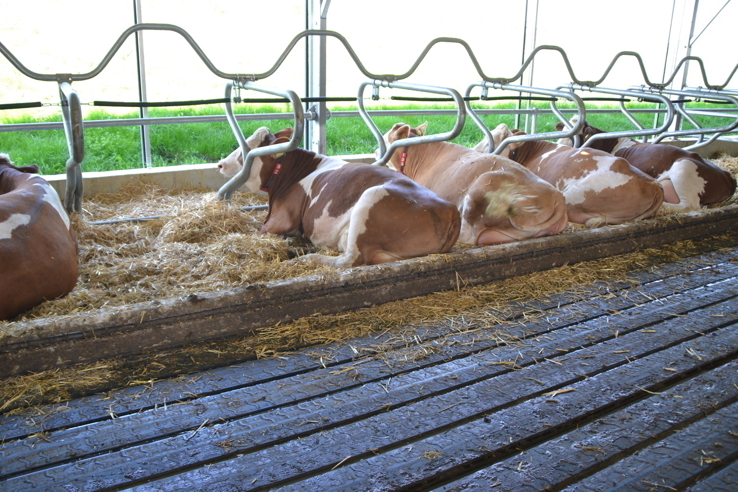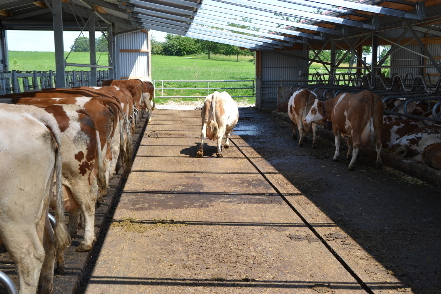 Die Böden der Fressgänge sind ebenfalls emissionsmindernd ausgeführt. Ein 3%-iges Quergefälle zu beiden Seiten einer Harnrinne leitet den Harn ab.