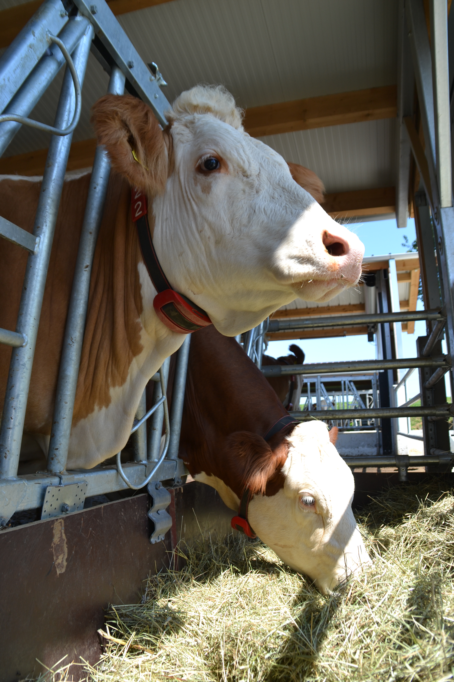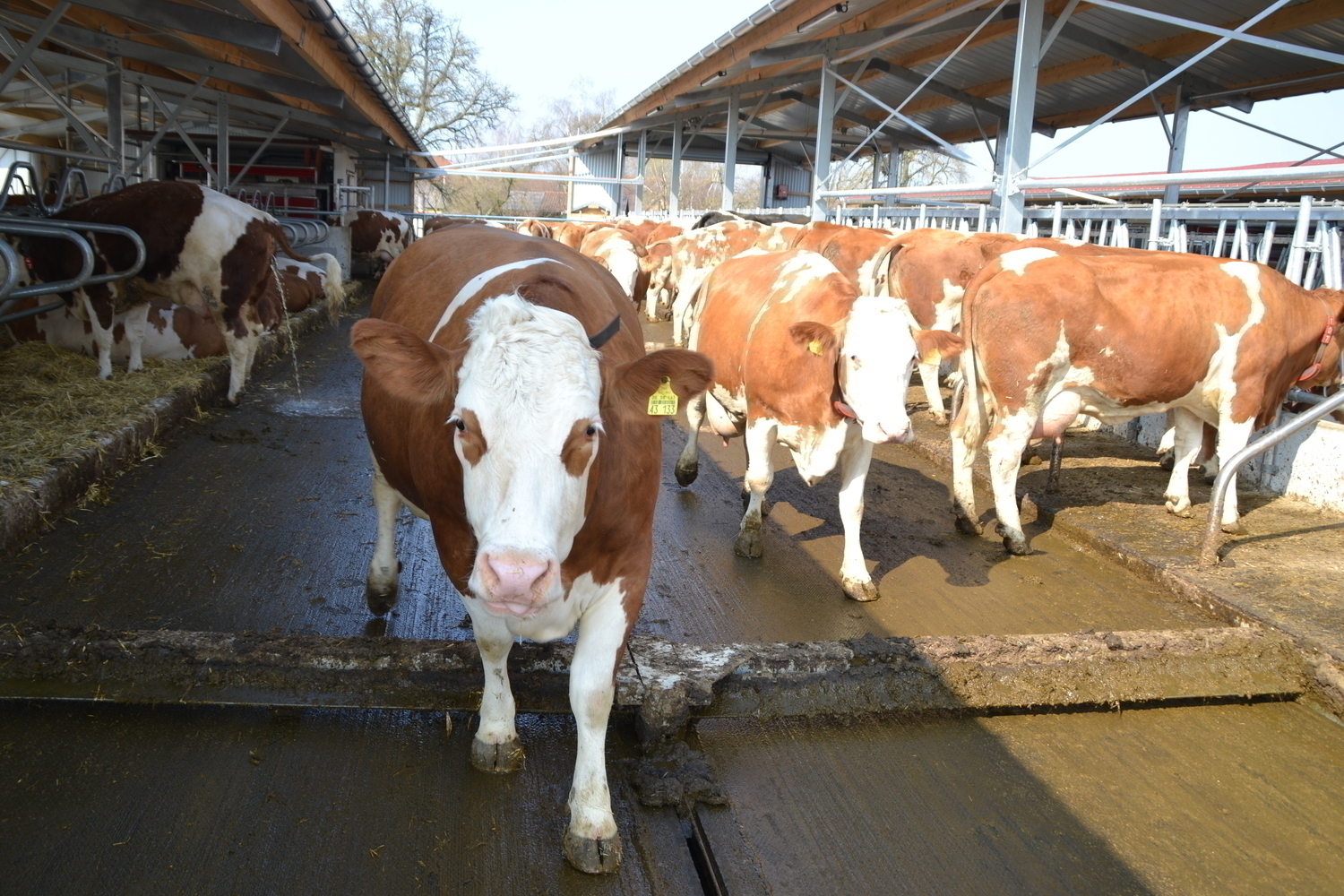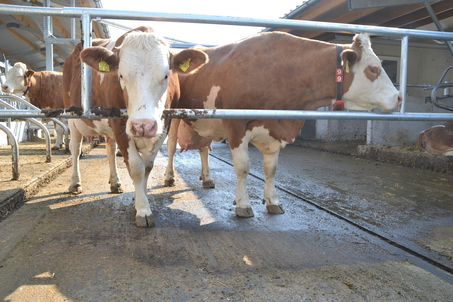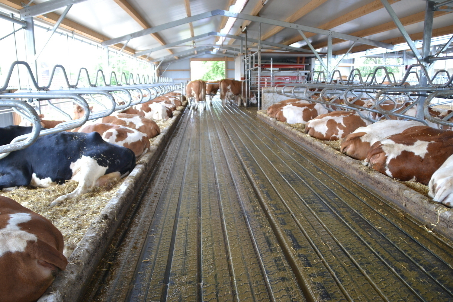 Die erhöhten Fressstände reduzieren die emitierende Fläche. Der Entmistungsschieber kann deutlich häufiger abschieben, ohne die Kühe beim Fressen zu stören.