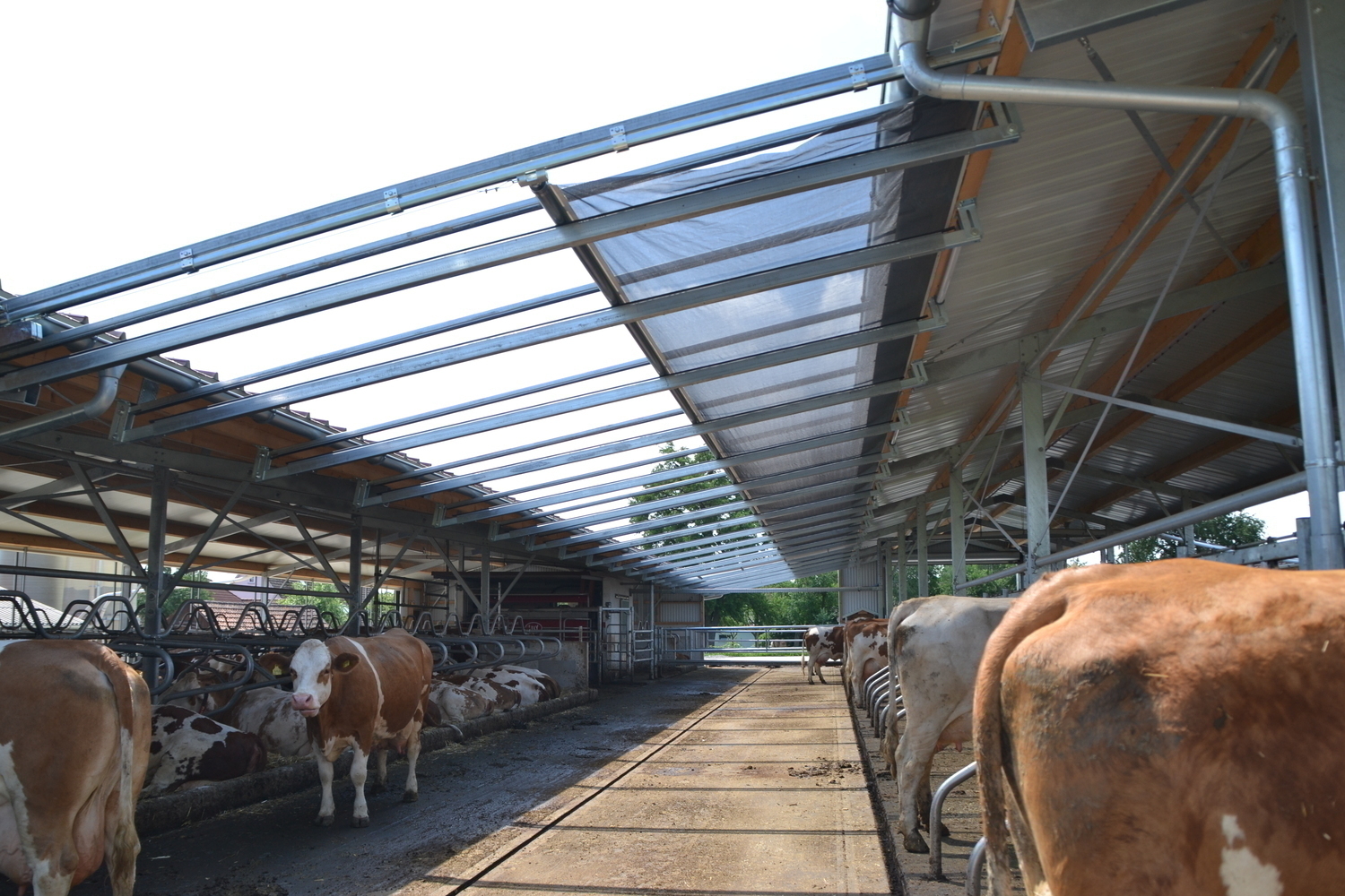 Durch die mehrhäusige Bauweise steht zu beiden Seiten des mittigen Futtertisches ein integrierter Laufhof zu Verfügung