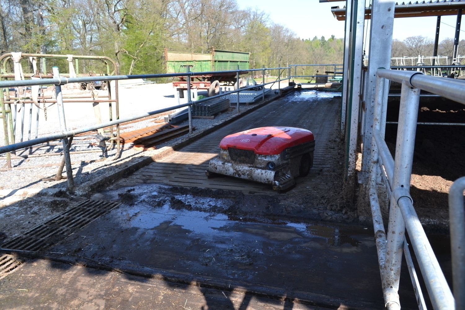 Der Saug-Entmistungsroboter reinigt die Fressgänge, die Übergänge und den Wartehof.