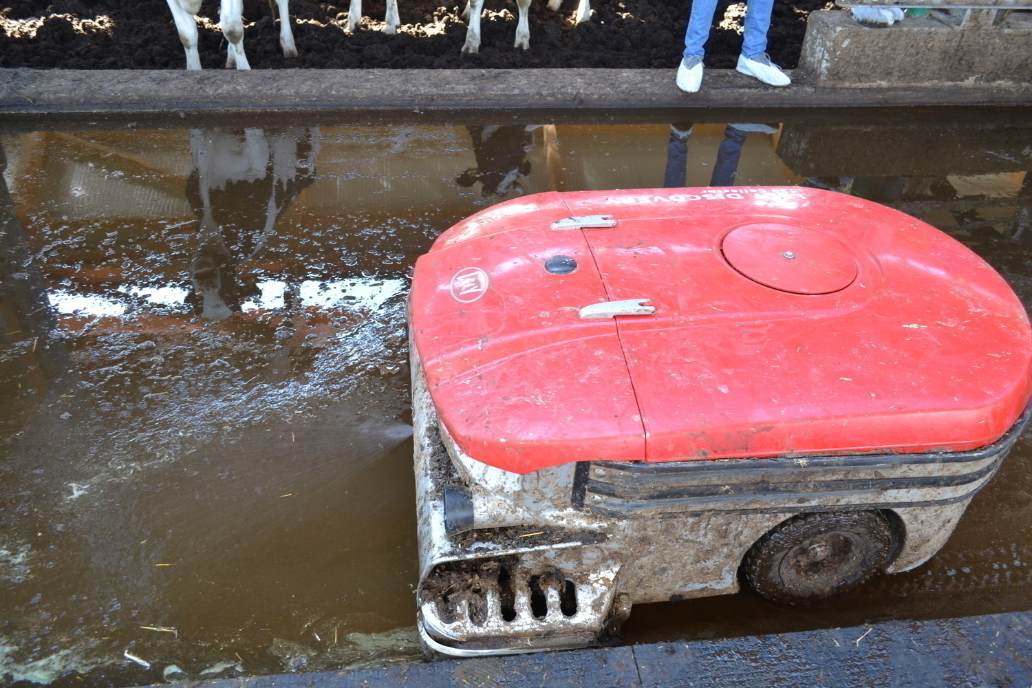 Der Saug-Entmistungsroboter verfügt über einen Wassertank. Er befeuchtet die Flächen vor Überfahrt, vermindert so Schmierschichten und erreicht ein besseres Reinigungsergebnis.