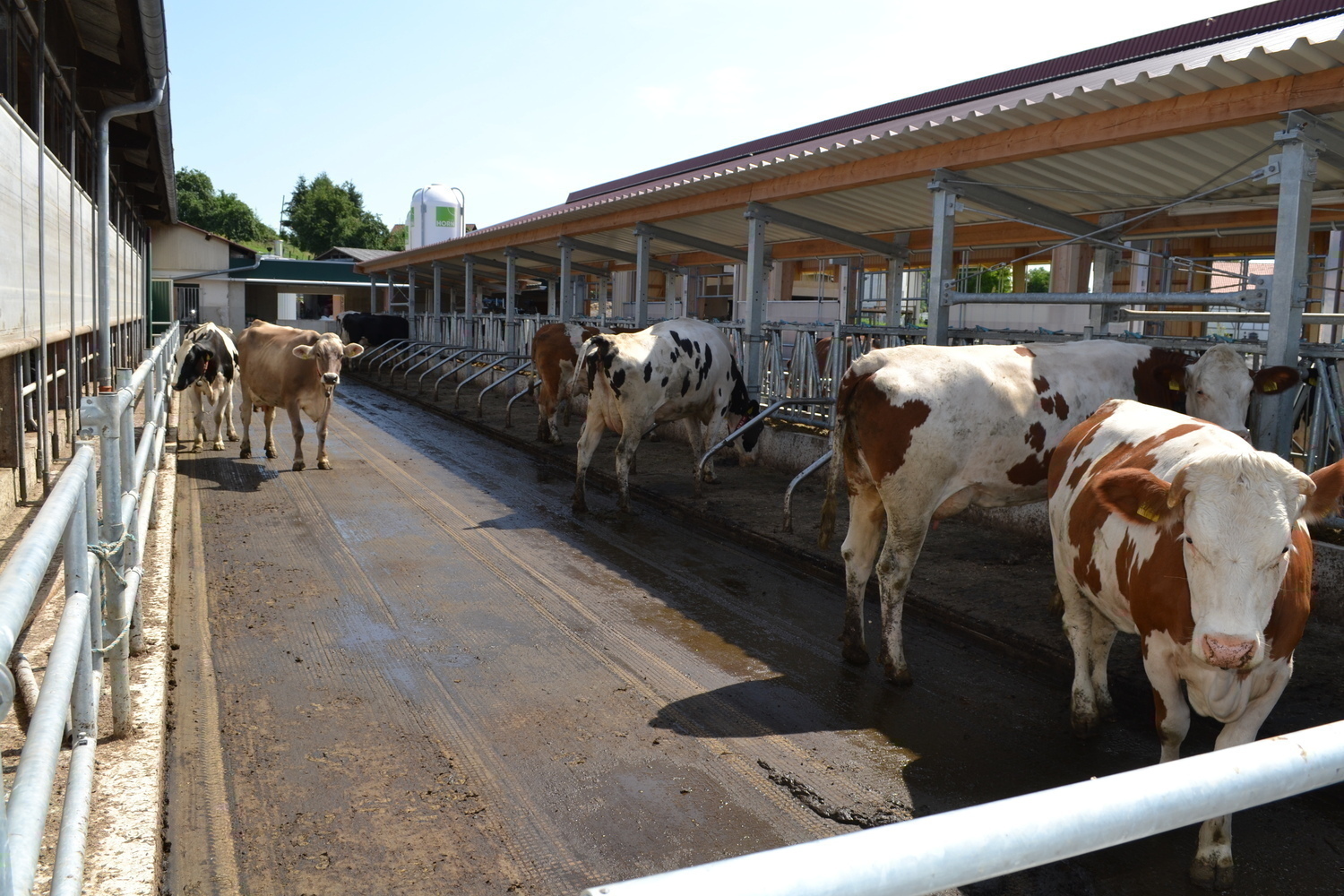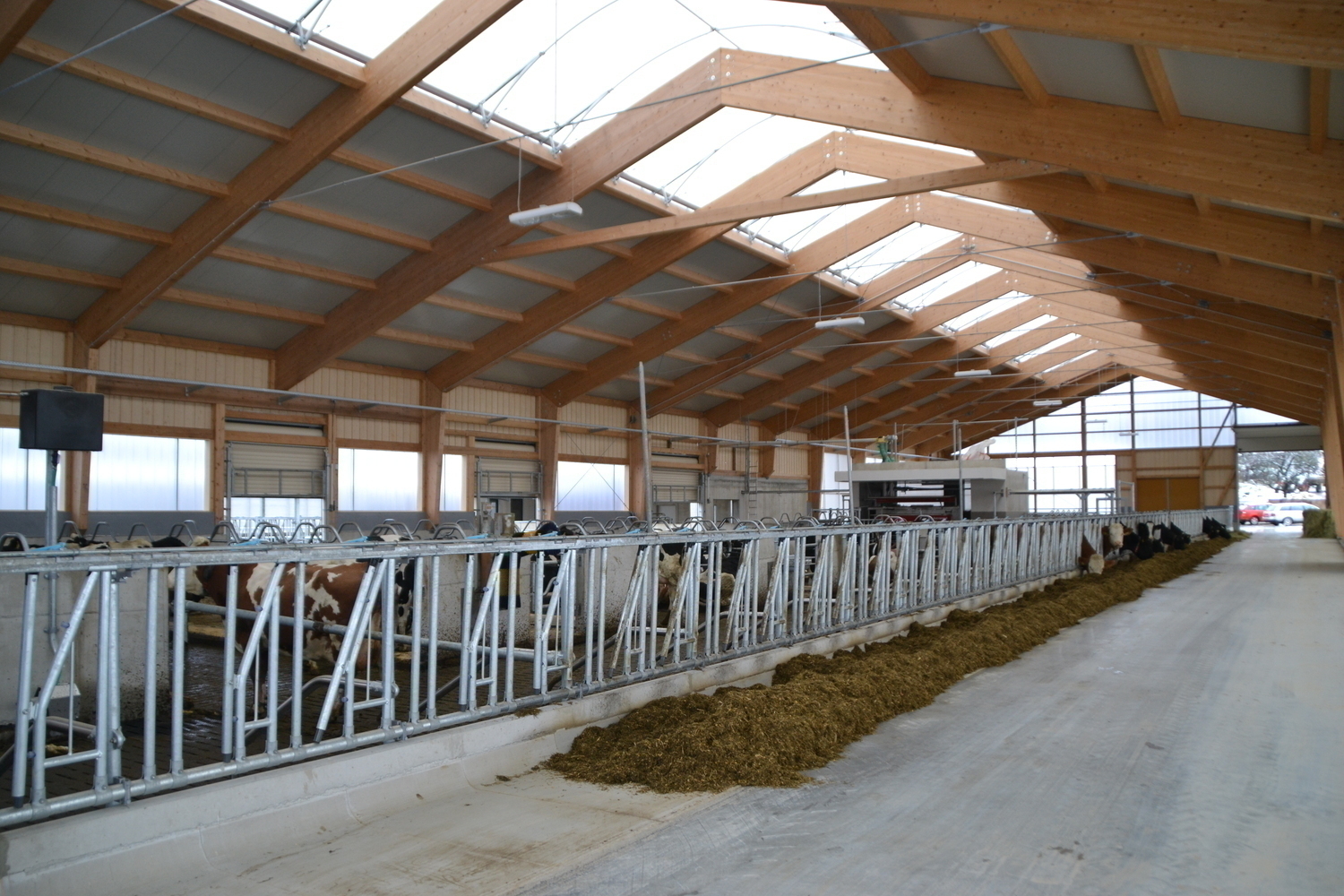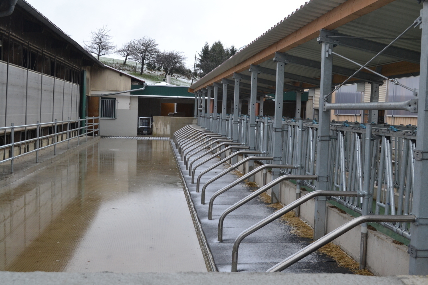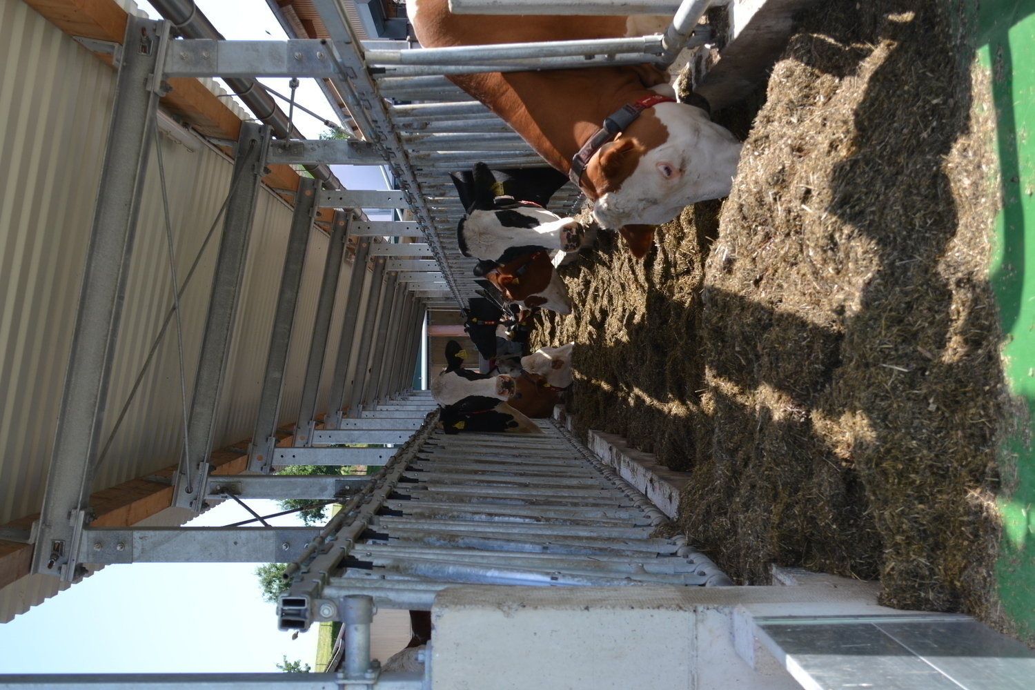 Der Laufhof verfügt über einen Stichfuttertisch mit Futterband. Er bietet sowohl den Kühen aus bestehenden Stall, als auch dem denen aus dem Neubau einen Freigeländezugang und zusätzliche Fressplätze.