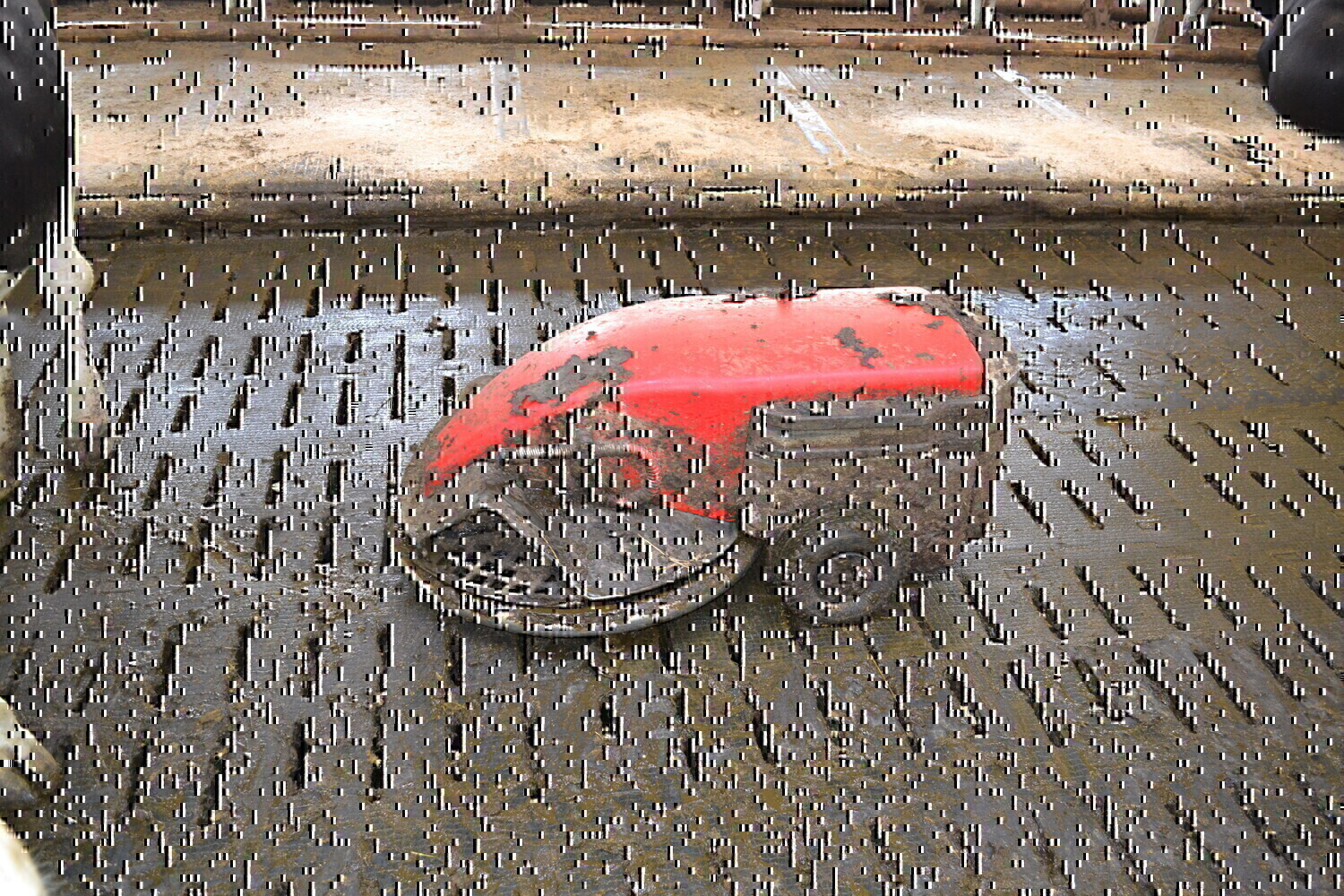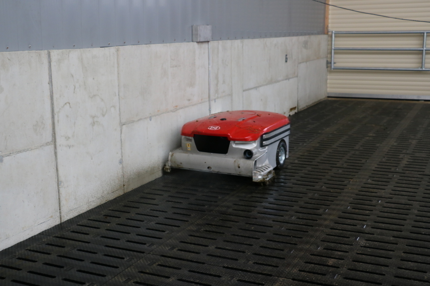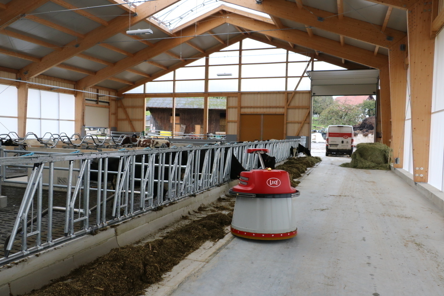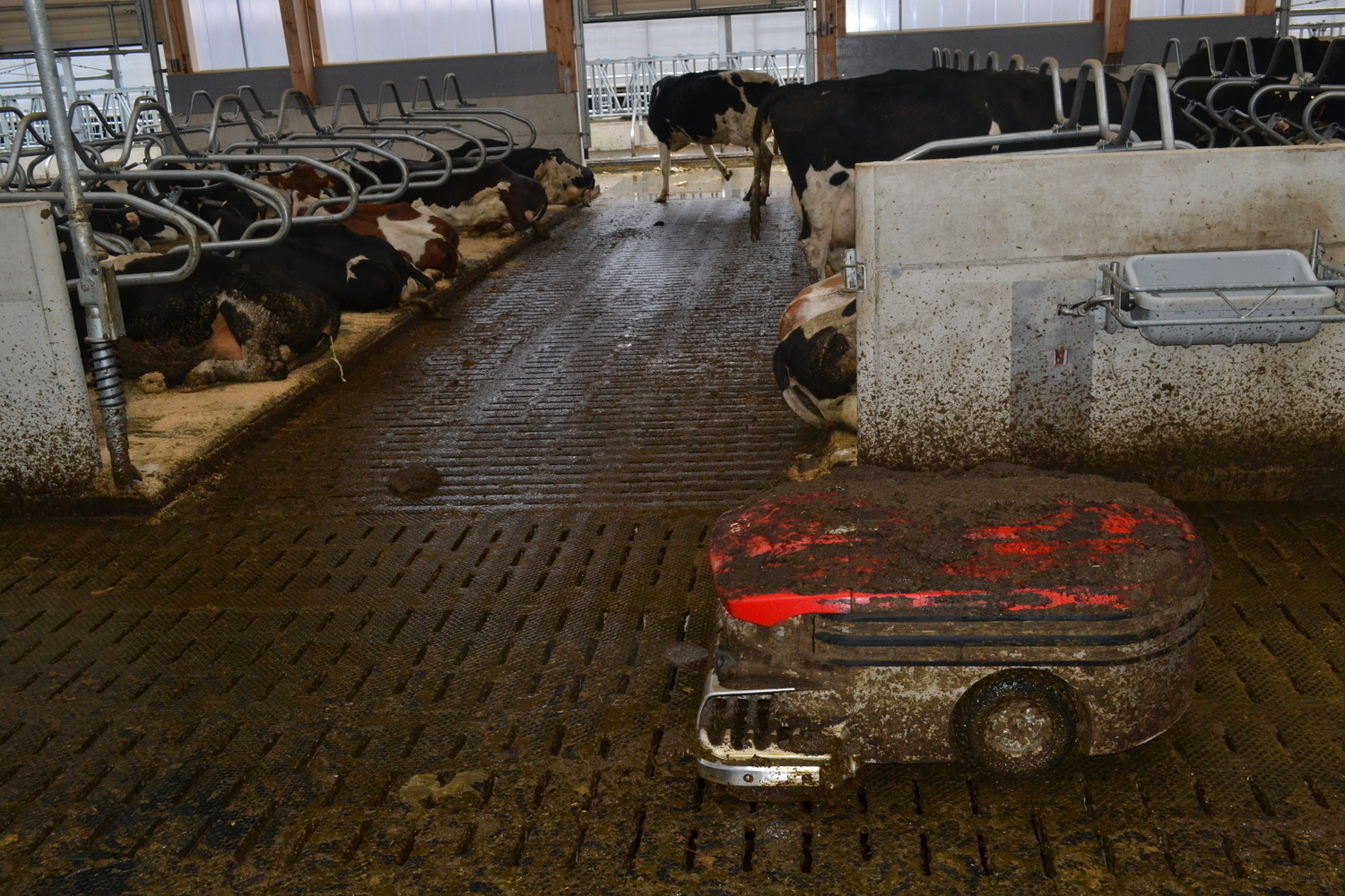 Der Spaltenboden im Stallinneren und die planbefestigten Flächen im Laufhof werden mit einem Saug-Entmistungsroboter gereinigt.