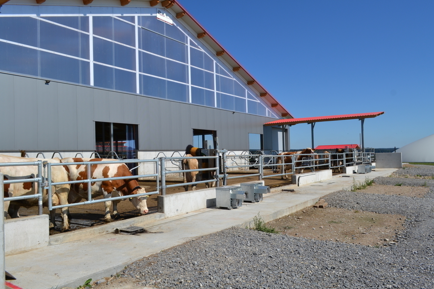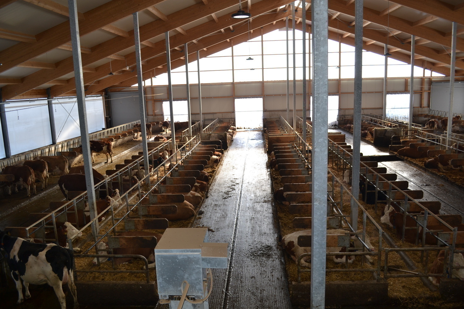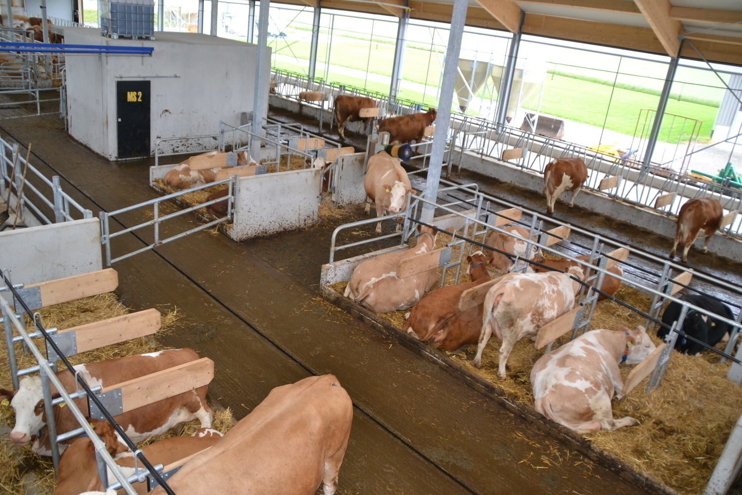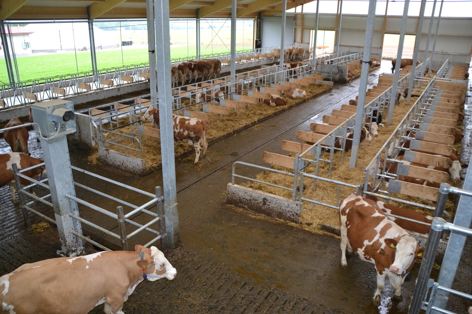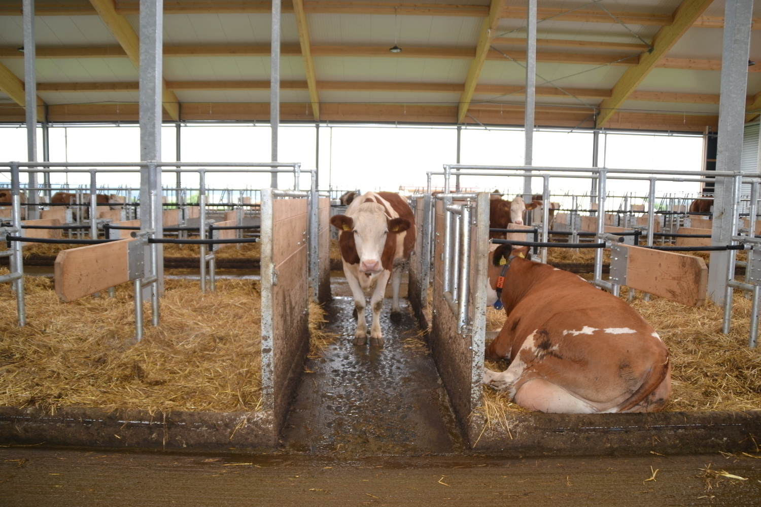 Der Laufhof wird zu Forschungszwecken abwechselnd mit und ohne Liegeboxen ausgefuehrt.