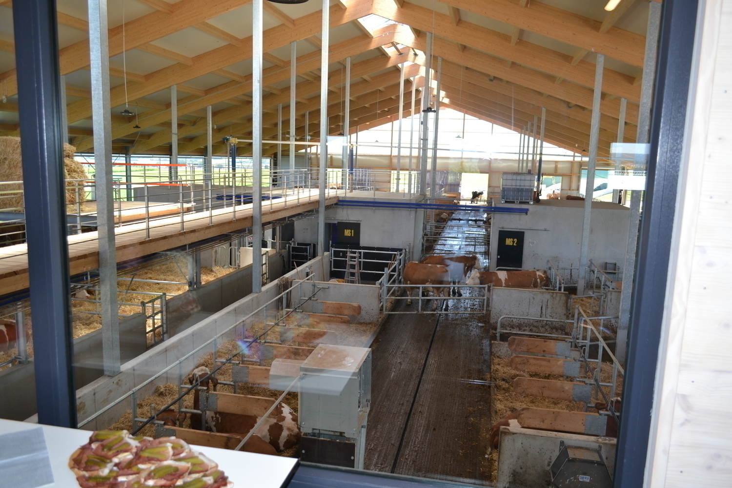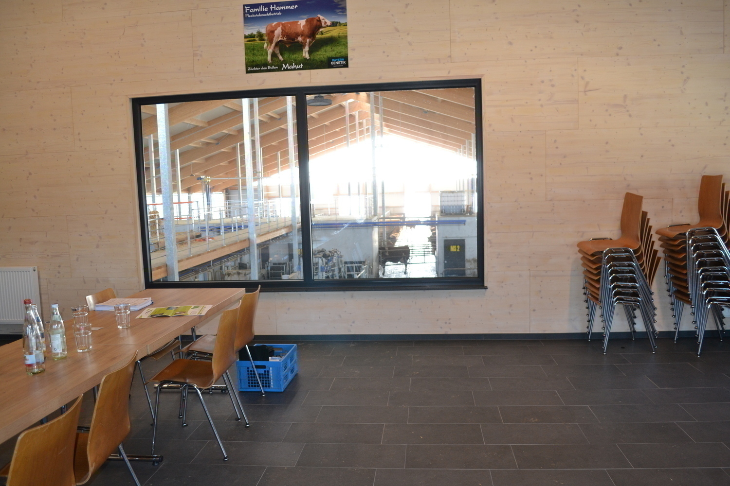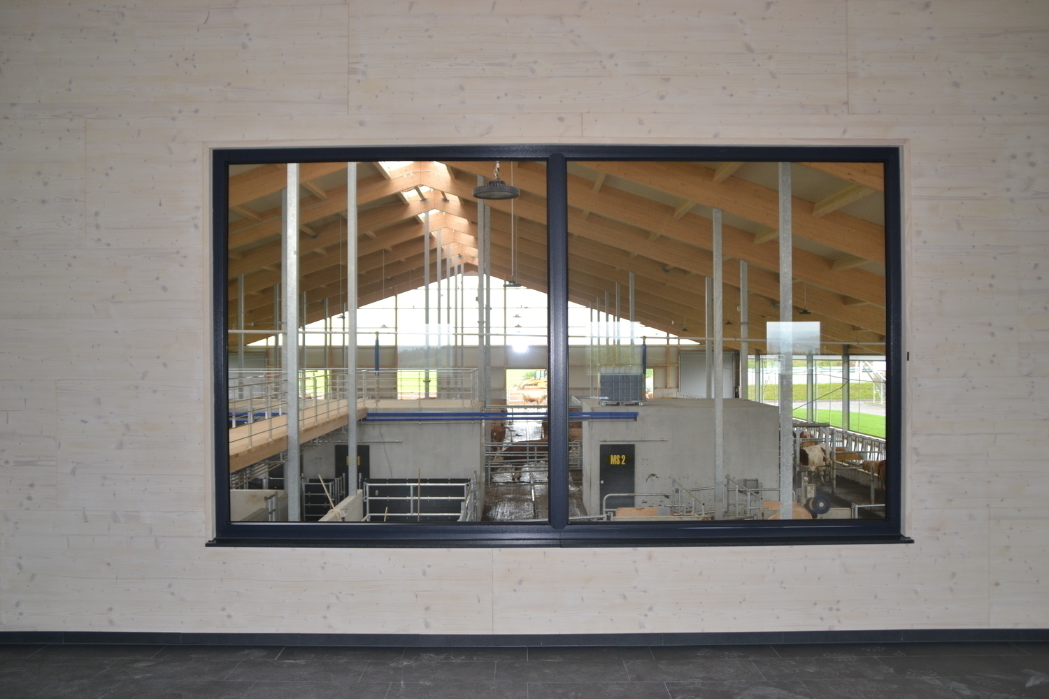 Blick durchs grosse Fenster des Besucherraums auf den Stall