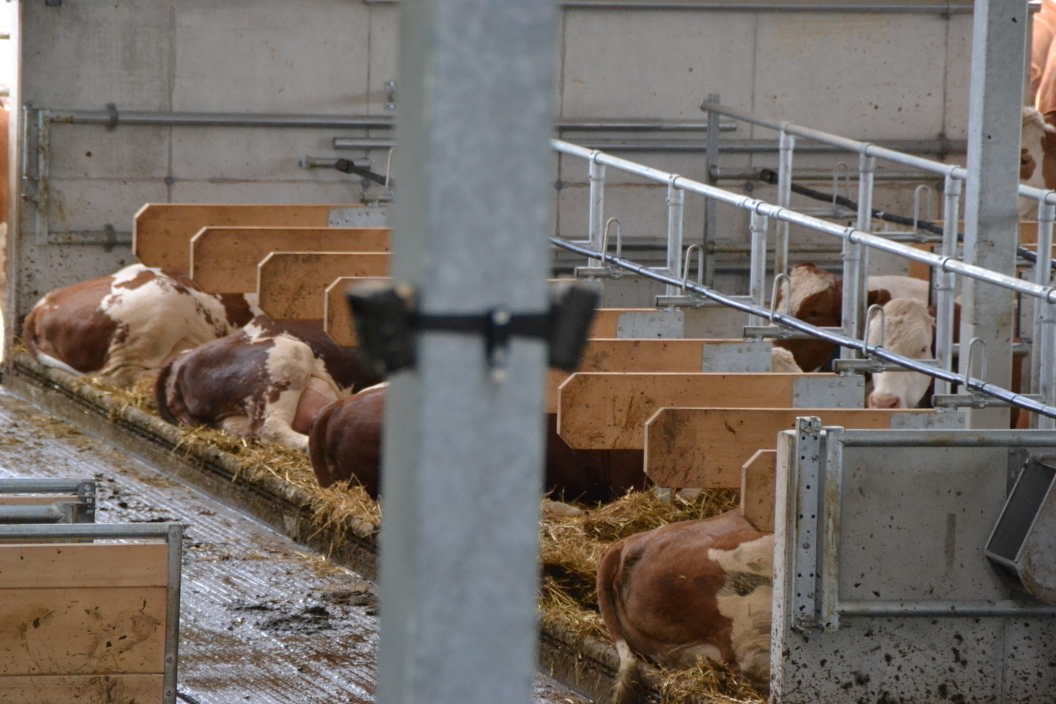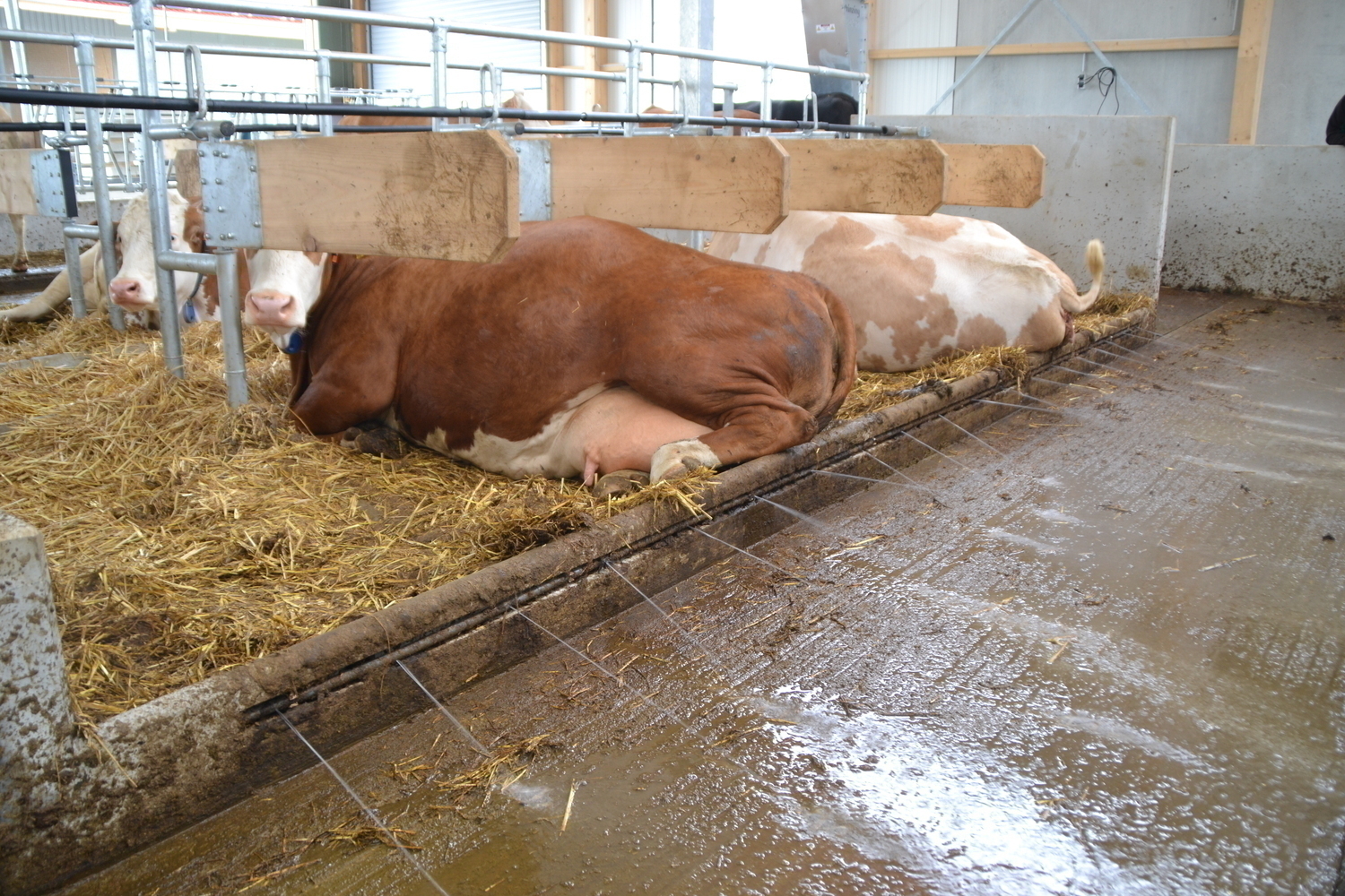 Die Liegeboxen wurden versetzt angeordnet, wodurch der Kopfraum vor dem Liegebereich optimal ausgenutzt werden kann. In den entstandenen Nischen im Quergang wurden Traenken installiert.