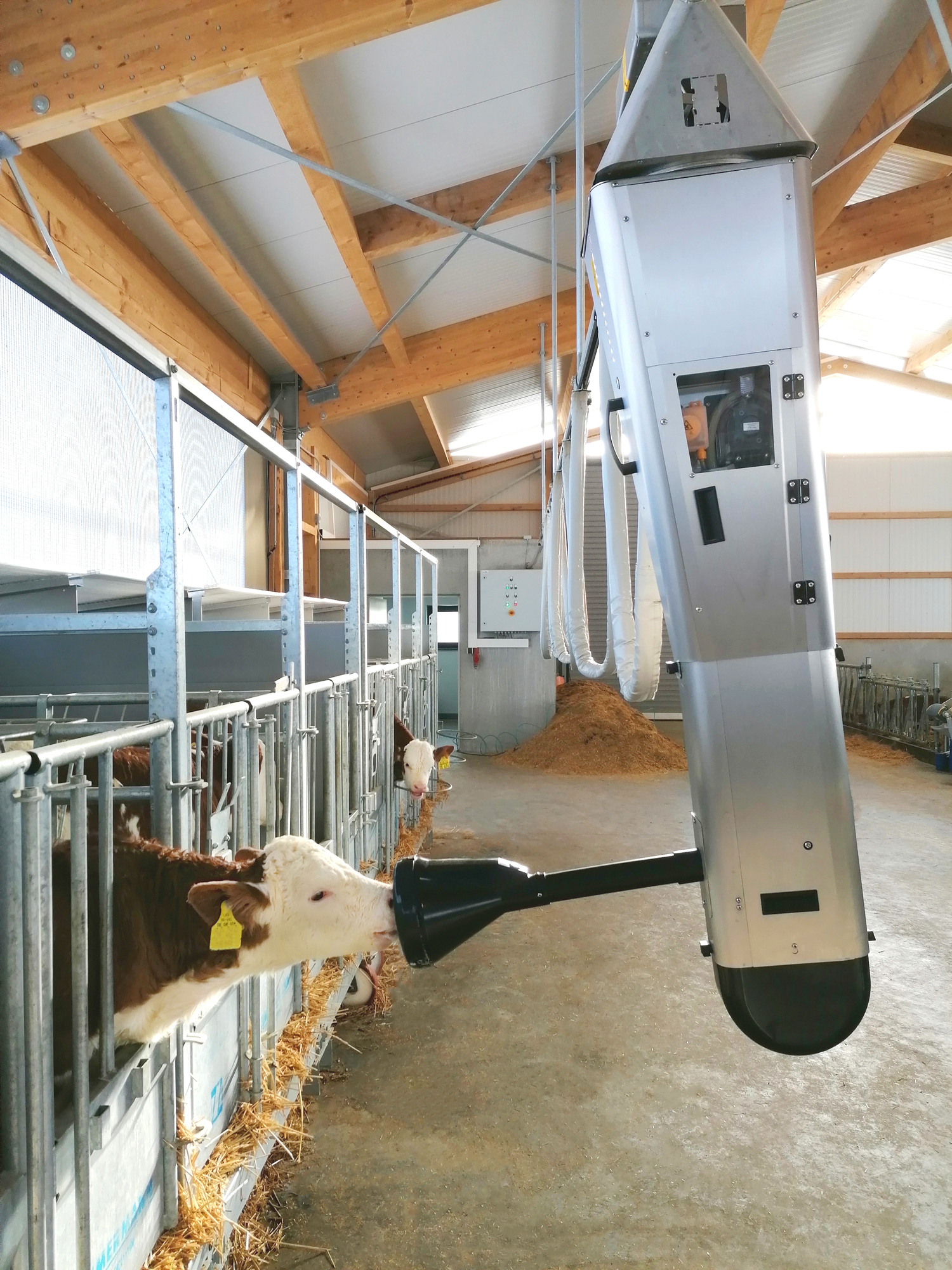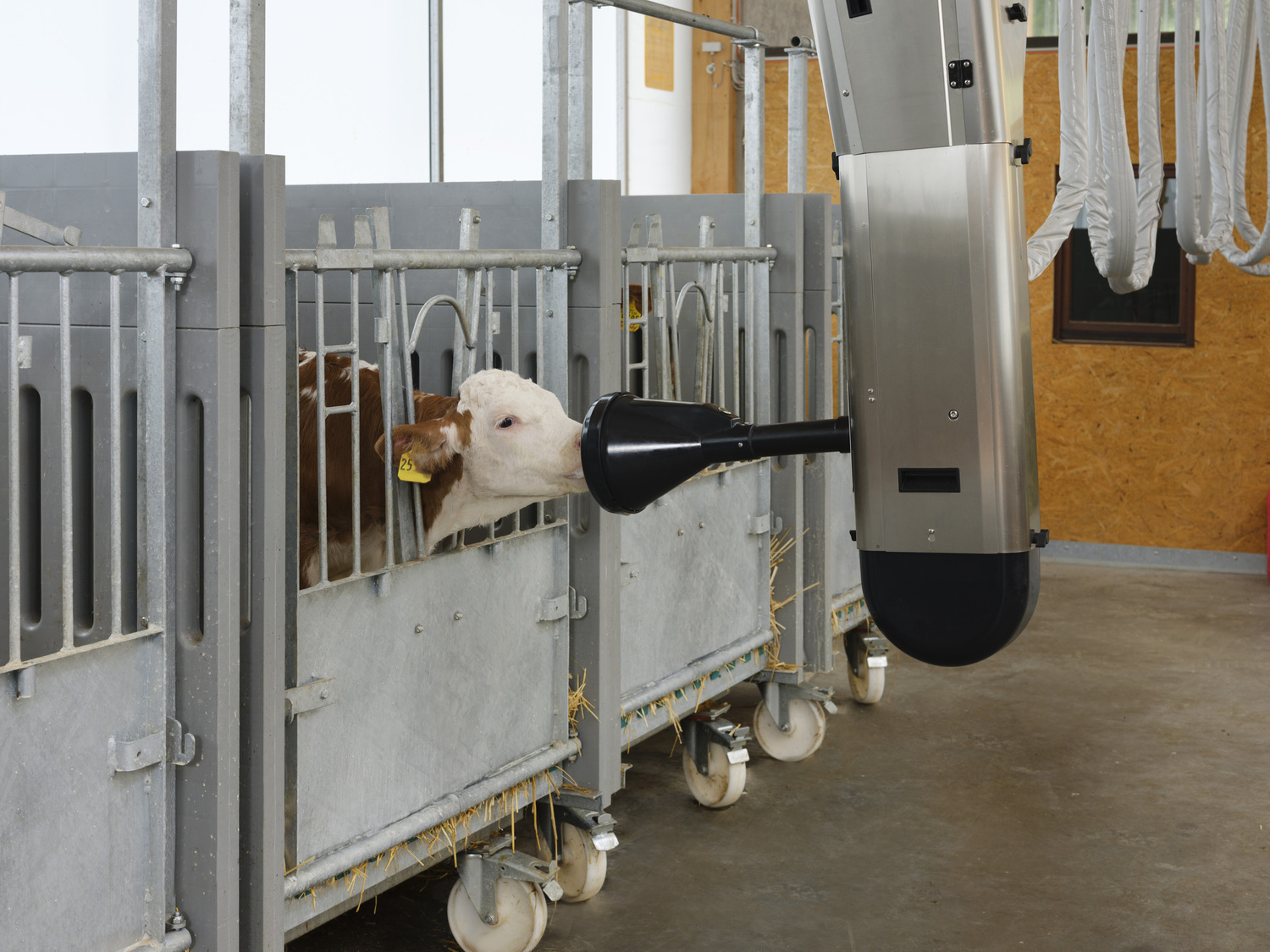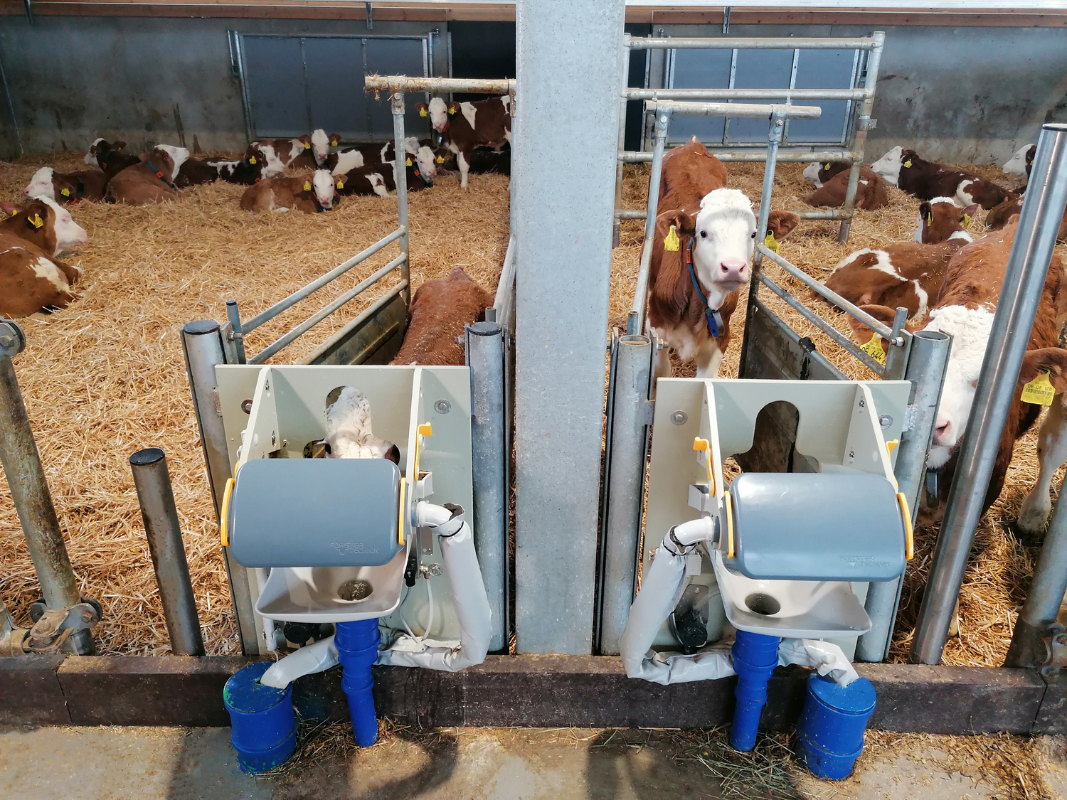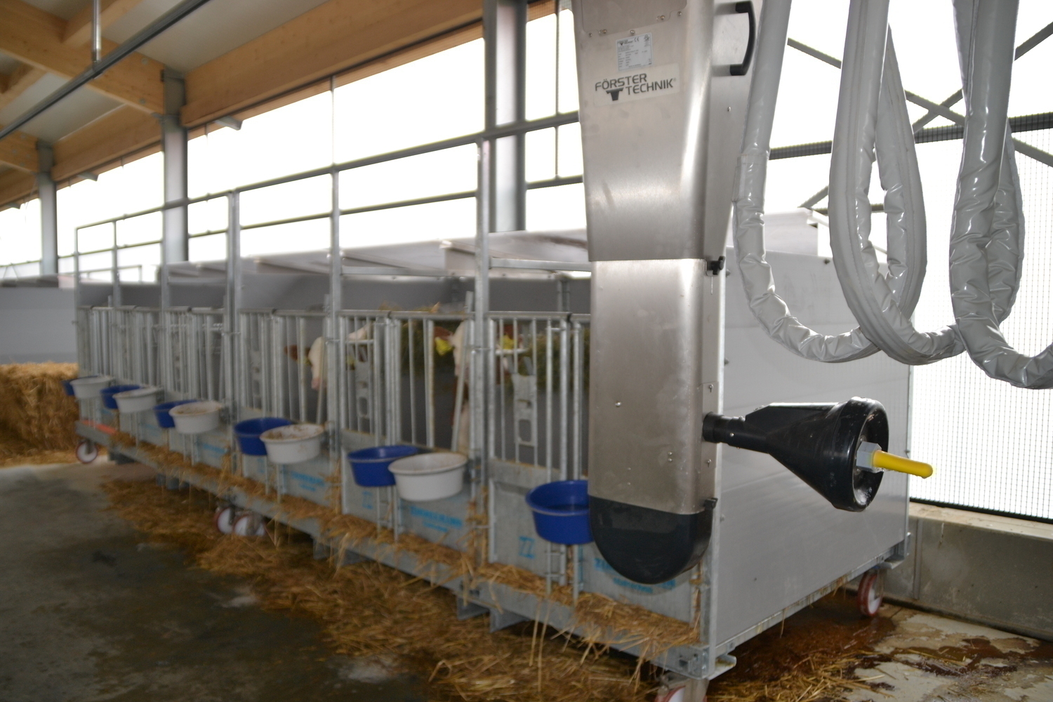 Bereits die Kaelber in den Einzelboxen koennen durch das Calf Rail System von Fa. Foerster automatisch gefuettert werden.