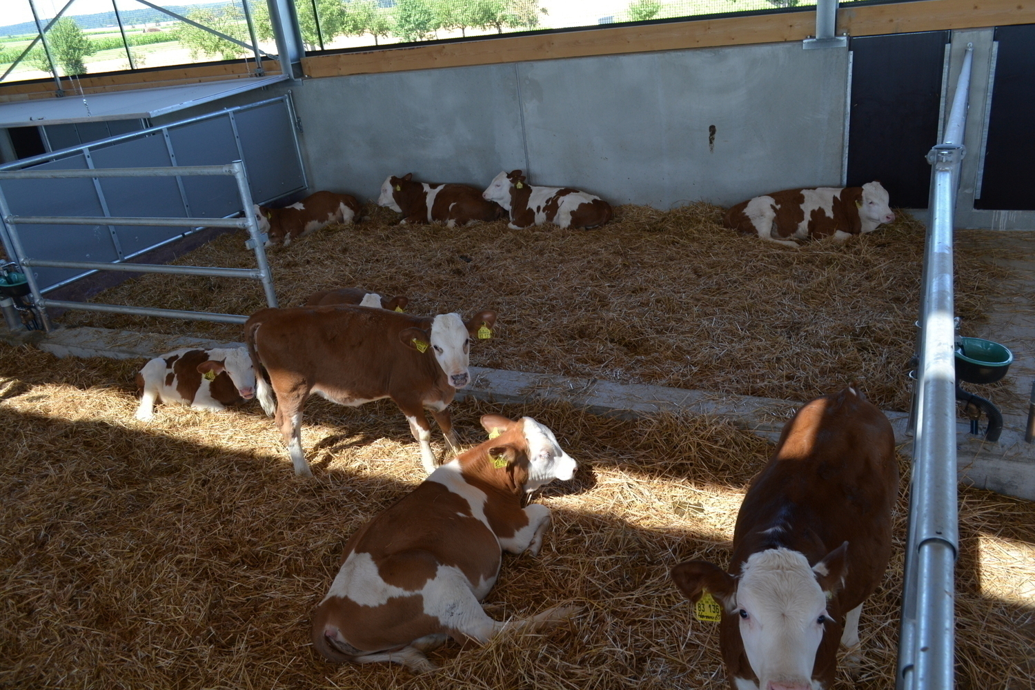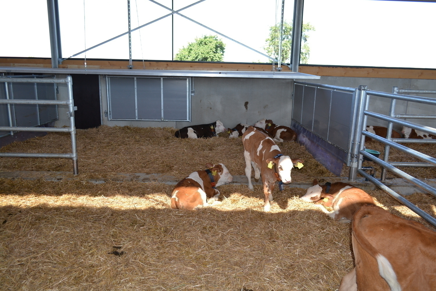 Die Kaelber in Gruppen werden automatisch gefuettert. Wenn die Weide fertig ist, koennen sie durch das Tor auf die Kaelberweide und es wird der Windfang aufgeklappt.